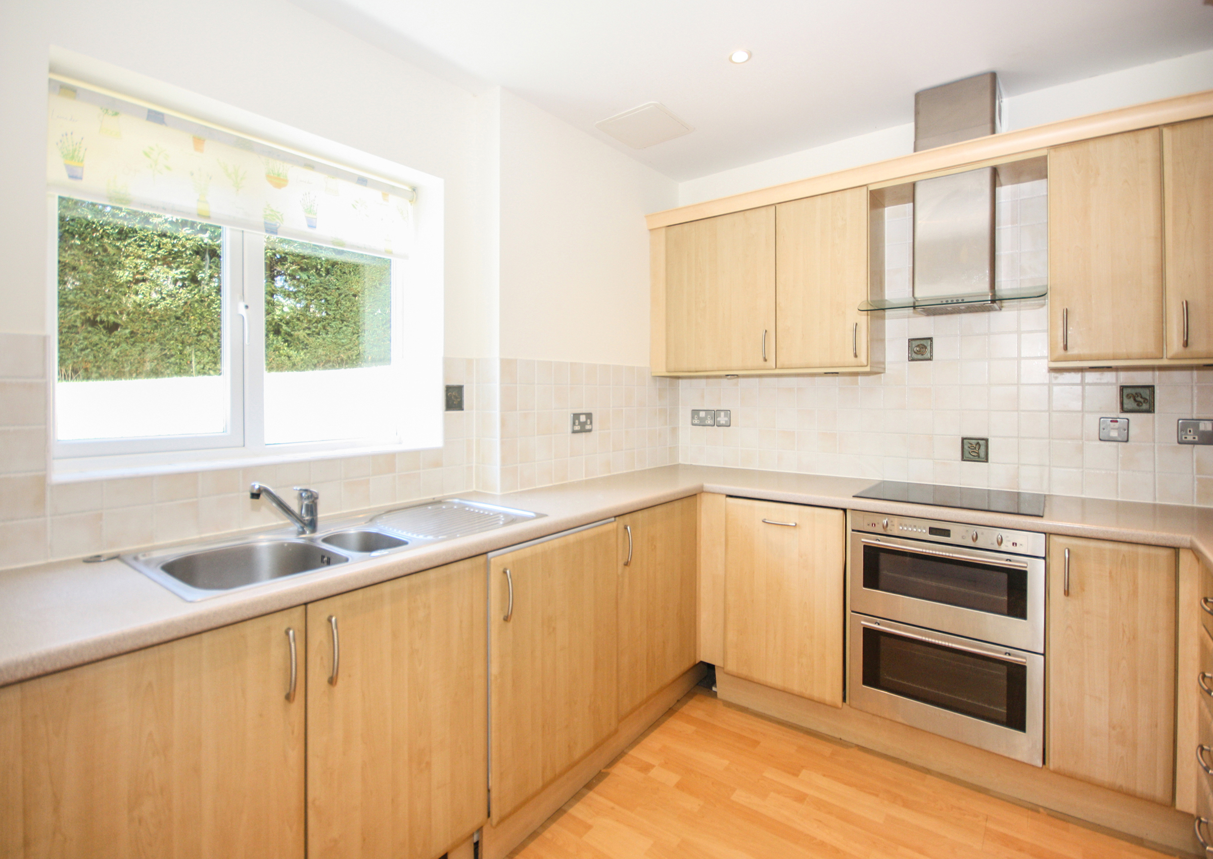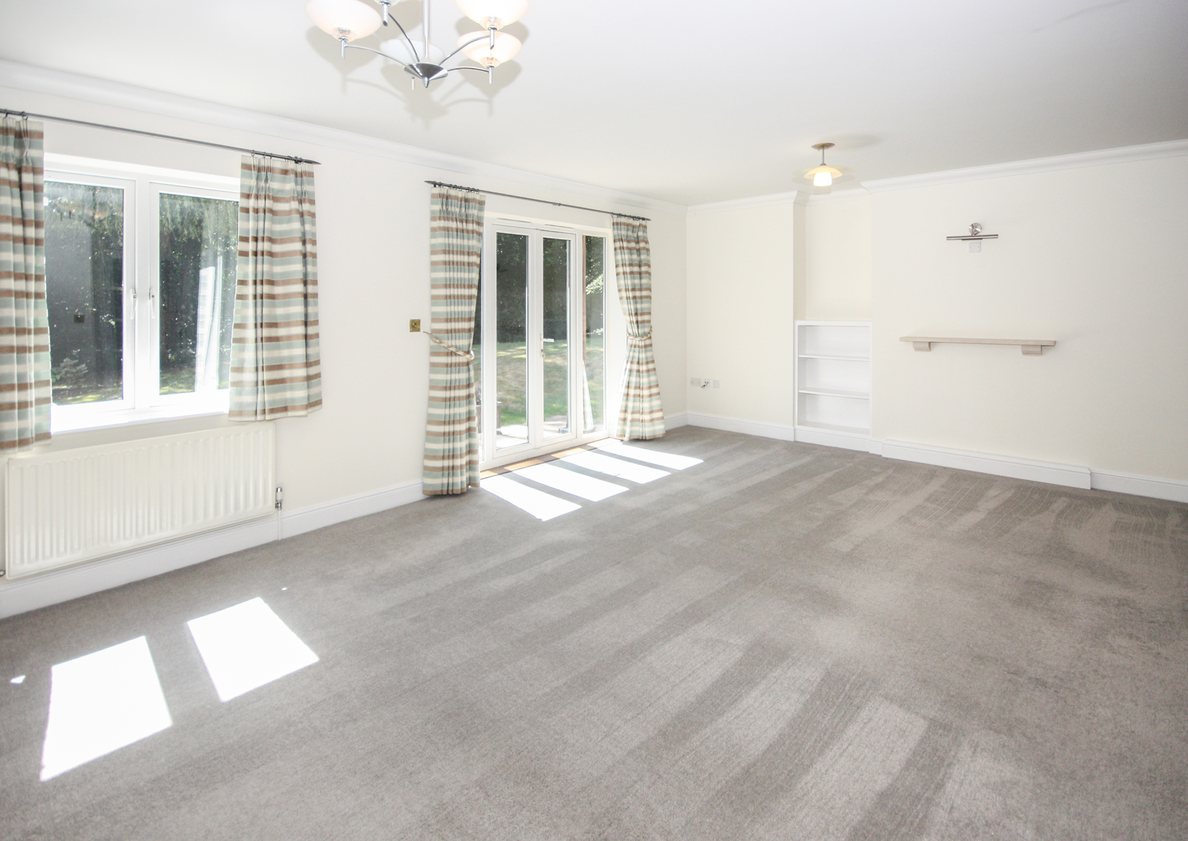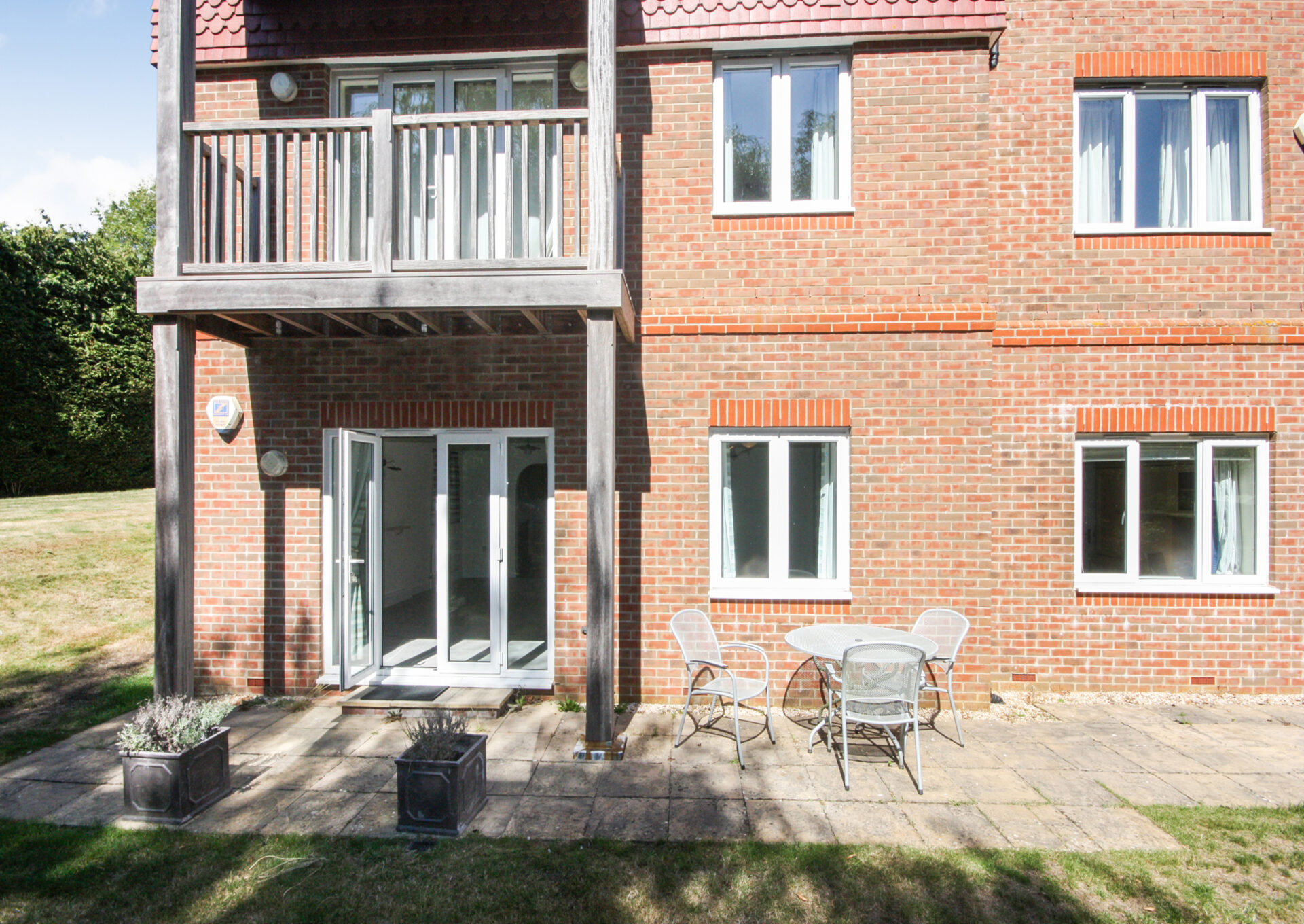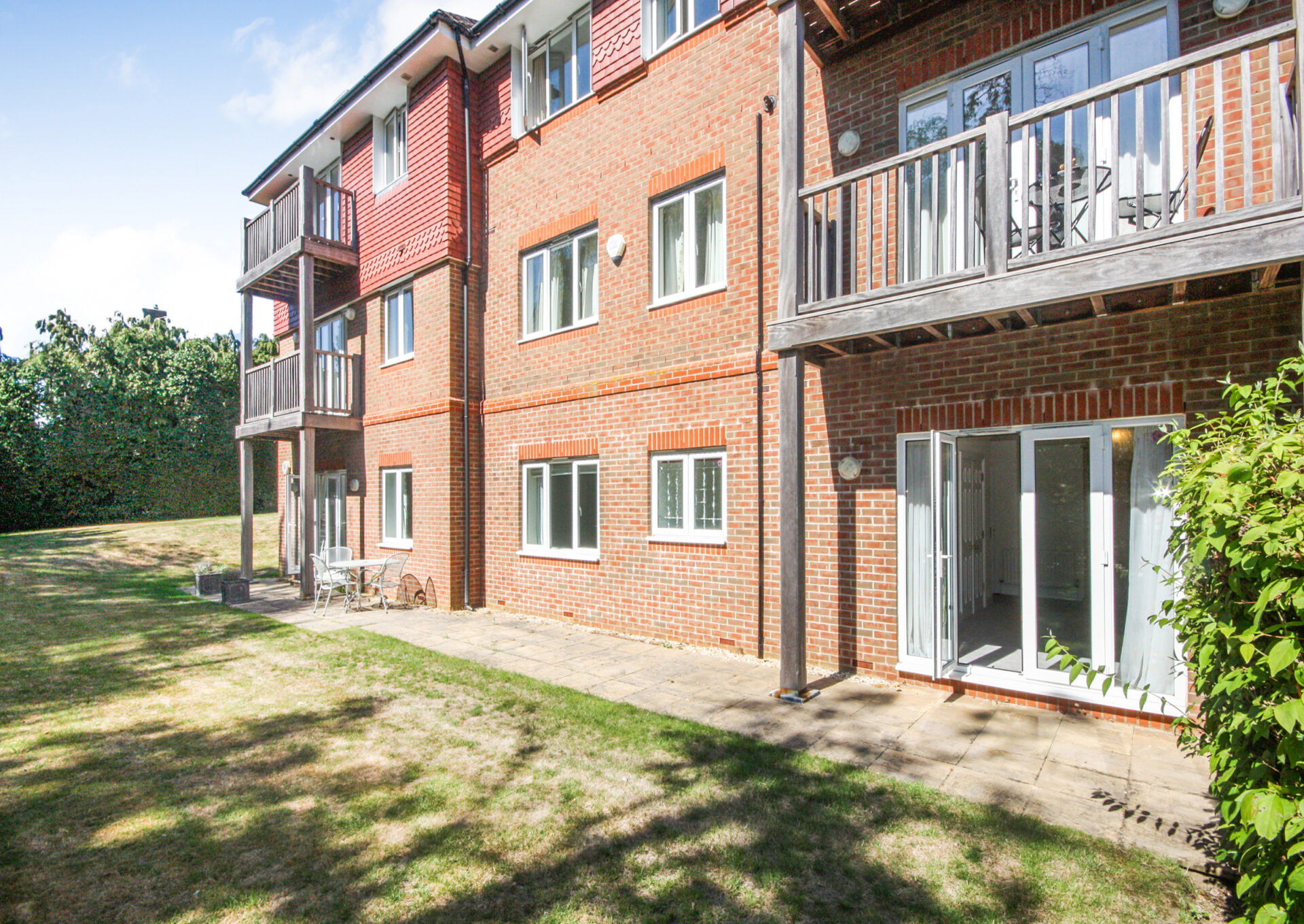 Access to the apartment is through a secure main entrance, leading to a lift and stairs to the lower ground floor. The front door of the apartment opens into a spacious hallway, complete with a video-entry system, a coats cupboard and a boiler cupboard. Double doors lead to a well-sized living and dining room with direct access to a west-facing patio that overlooks the landscaped gardens. The kitchen is fitted with a range of cabinets as well as integrated appliances, including a fridge/freezer, slimline dishwasher, washing machine, double oven and hob with extractor fan. The main bedroom features built-in wardrobes, double doors to the patio and an en-suite bathroom with a separate shower. The second bedroom is also a spacious double with built-in wardrobes, serviced by a separate bathroom.