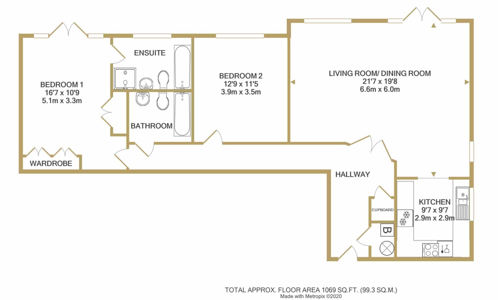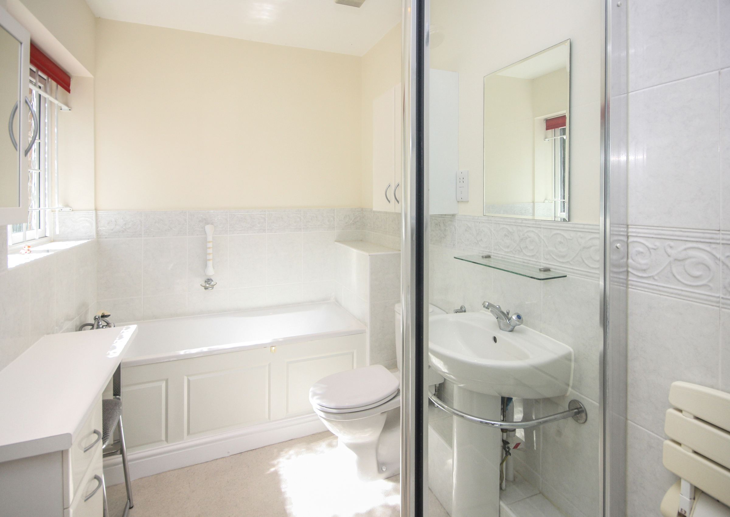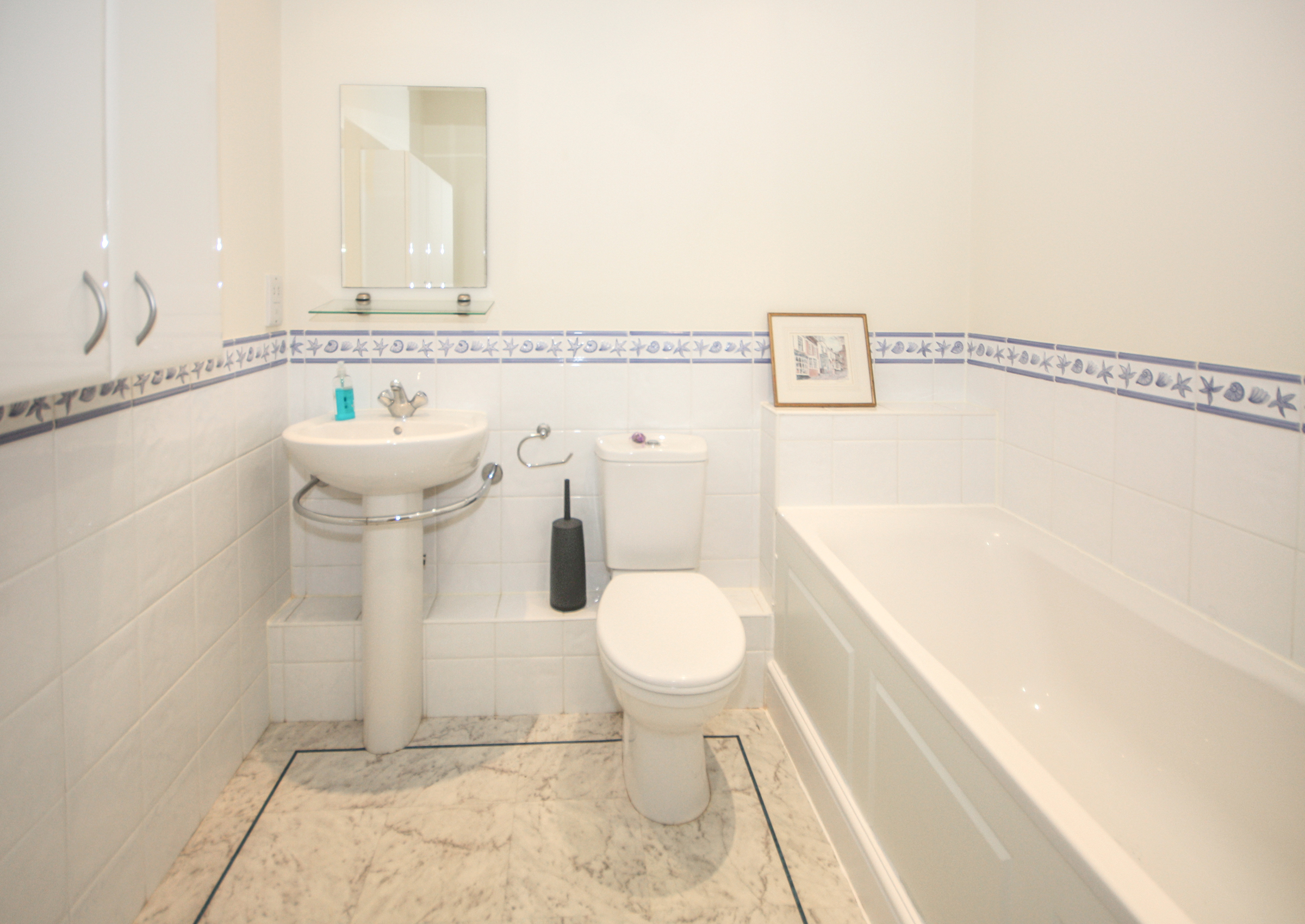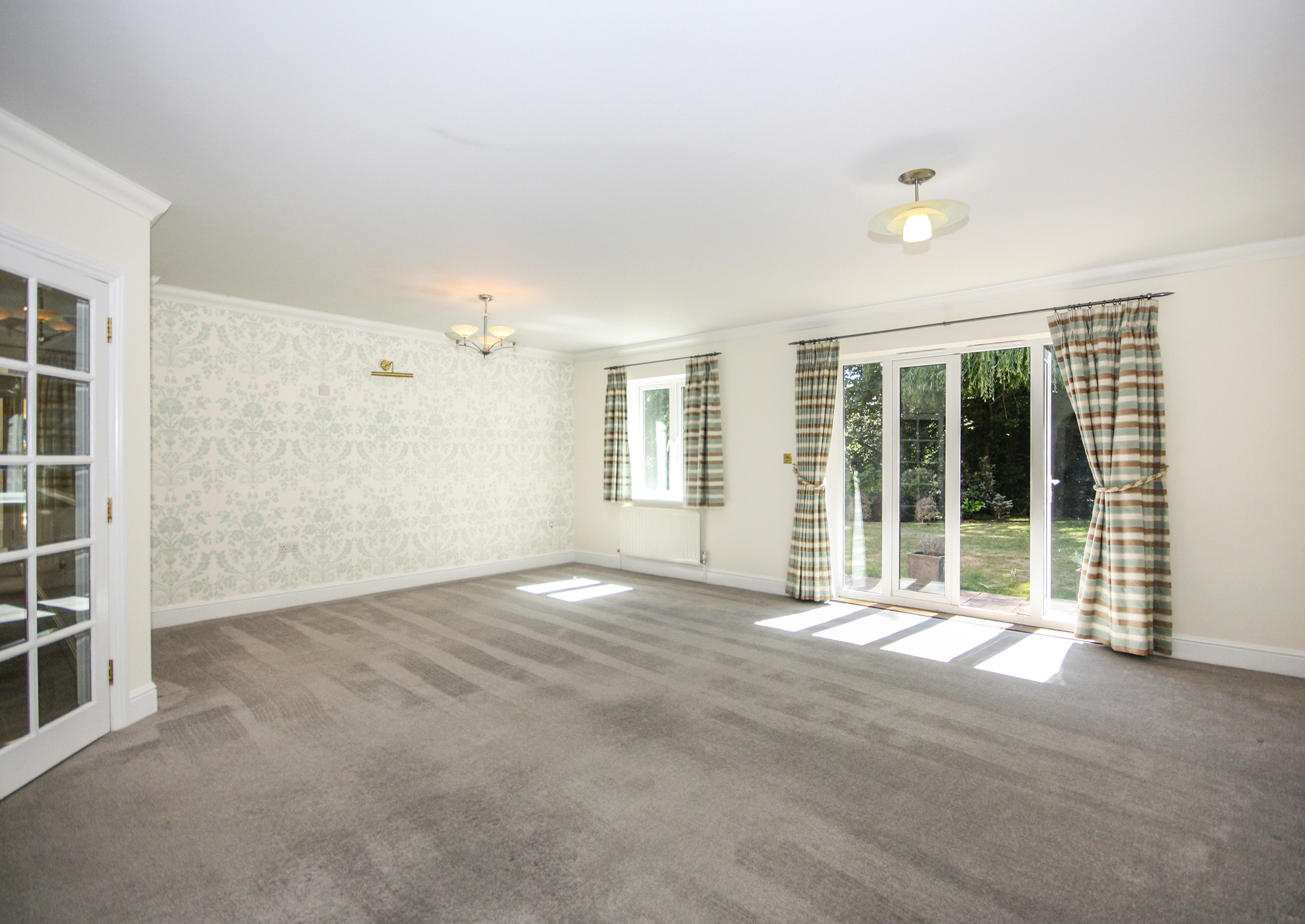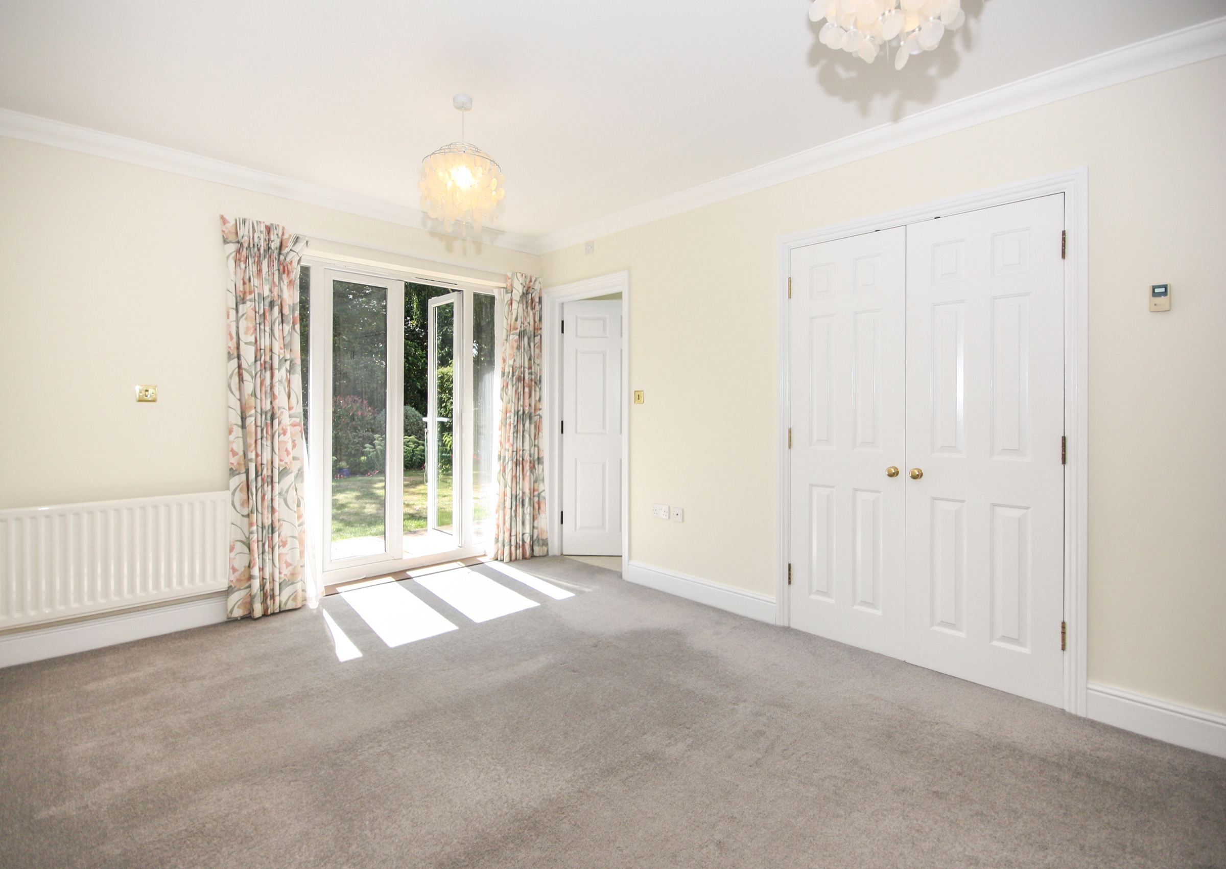 Access to the apartment is through a secure main entrance, leading to a lift and stairs to the lower ground floor. The front door of the apartment opens into a spacious hallway, complete with a video-entry system, a coats cupboard and a boiler cupboard. Double doors lead to a well-sized living and dining room with direct access to a west-facing patio that overlooks the landscaped gardens. The kitchen is fitted with a range of cabinets as well as integrated appliances, including a fridge/freezer, slimline dishwasher, washing machine, double oven and hob with extractor fan. The main bedroom features built-in wardrobes, double doors to the patio and an en-suite bathroom with a separate shower. The second bedroom is also a spacious double with built-in wardrobes, serviced by a separate bathroom.