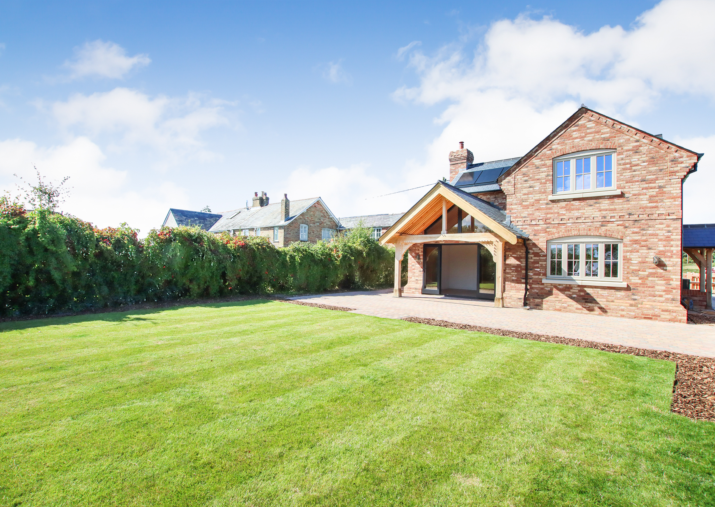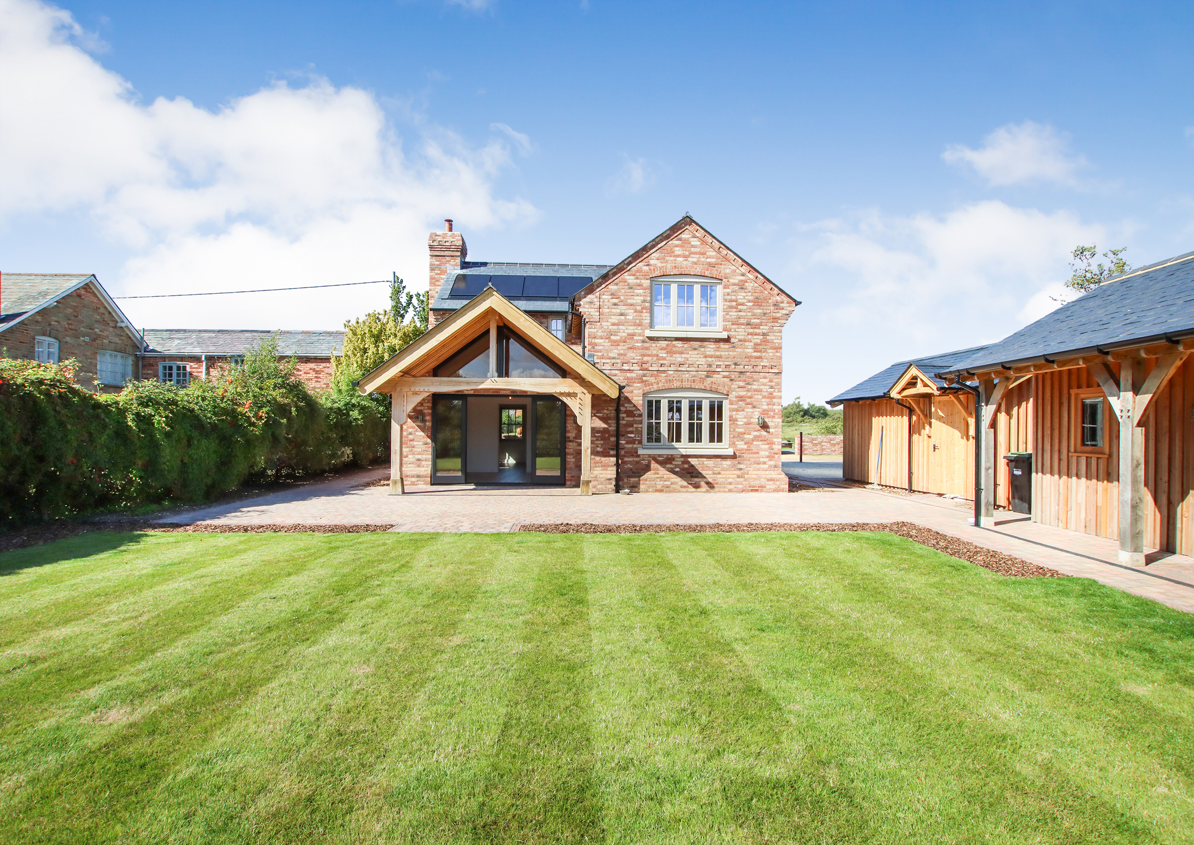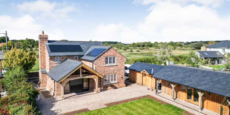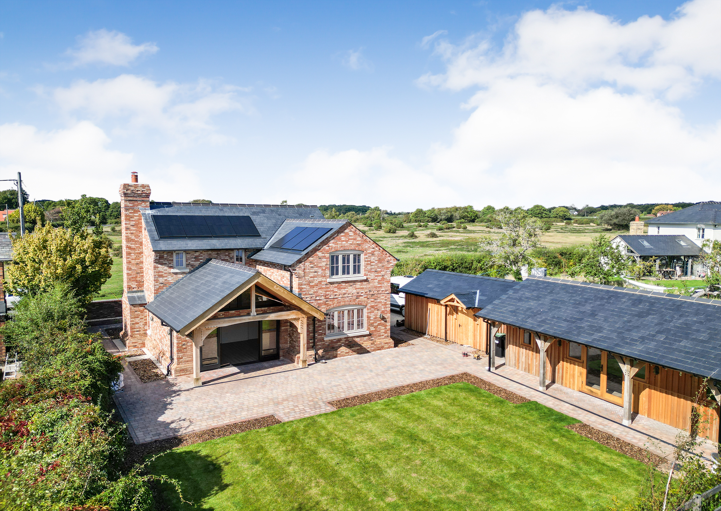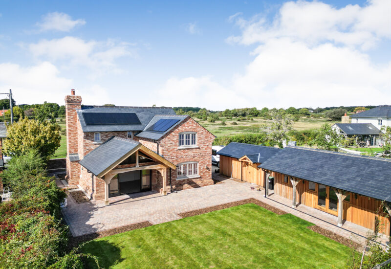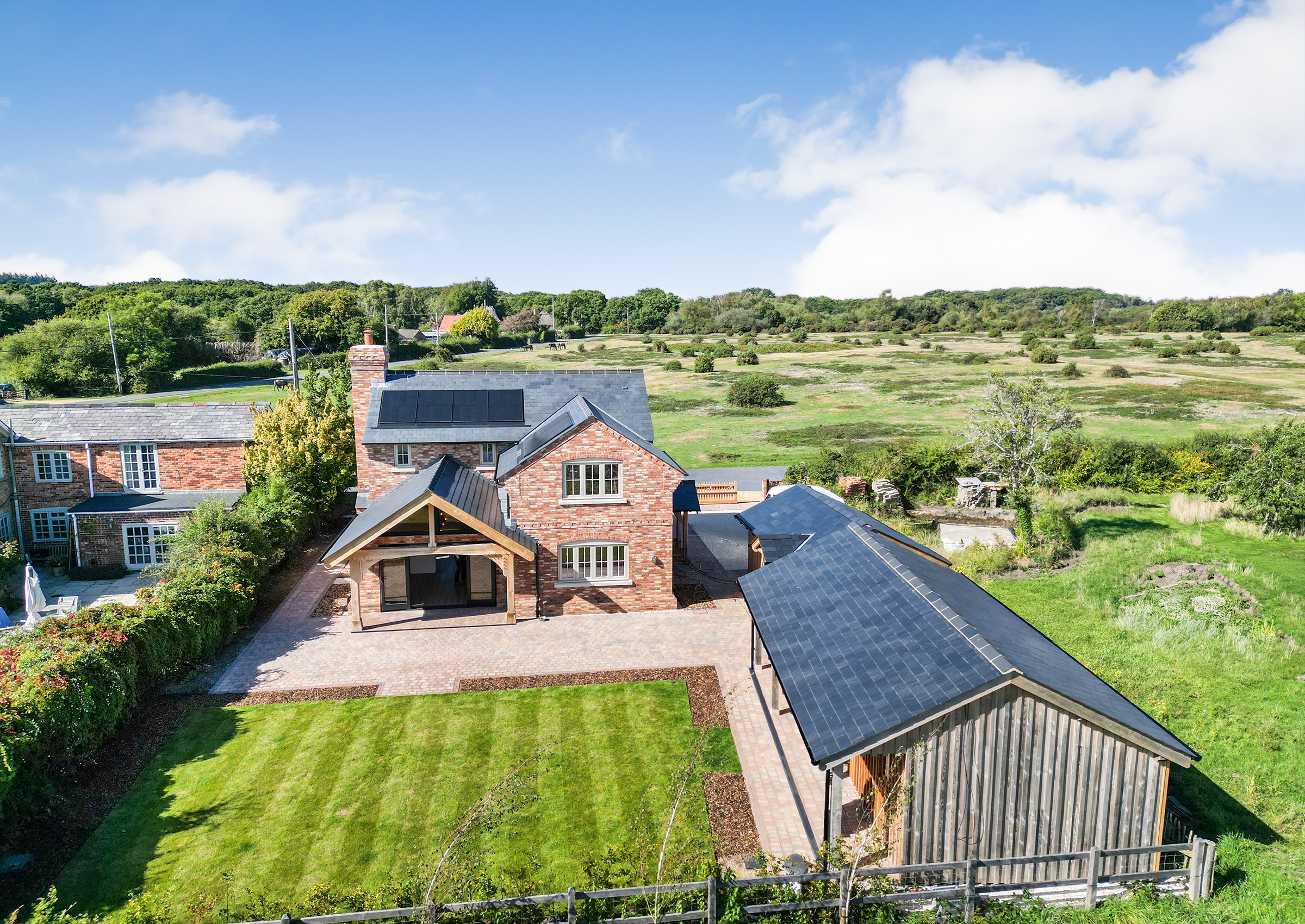 No expense has been spared in the creation of this bespoke home, where craftsman builders have lavished care and attention on every element. High quality materials are evident throughout, including oak-framed porches and individually made hardwood windows. A custom blended, colour-drench paint scheme throughout ties the finish together. Designed to be as practical as it is beautiful, the property incorporates modern, energy efficient systems including an air source heat pump, air circulation system, solar panels with battery storage and a pressurised hot water system. From the moment you step inside, the forest comes into view from a variety of aspects, bringing the setting into the heart of the home. The approach is through a sliding electric gate to a gravel driveway leading to the garage. with landscaped pathways to the front porch or side entrance. An EV charging point is also provided Inside, the light-filled hallway enjoys a view across the forest, there is a guest cloakroom with WC and a staircase rising to the first floor with a cupboard beneath housing the solar battery storage. Underfloor heating runs beneath Karndean flooring throughout the ground floor. The living room has a forest outlook to the front, complimented by a feature fireplace with a lined chimney ready for the installation of a wood-burning stove. A sliding pocket door opens into the dining area, a striking space with vaulted ceiling and French doors to the covered terrace. This flows into the kitchen, which has been fitted to a superb specification with Austrian cabinetry, a larder unit with power and lighting, quartz surfaces, a peninsula breakfast bar and a full range of Bosch integrated appliances including induction hob, double oven, fridge, freezer and dishwasher. The utility room provides further storage and space for laundry appliances, along with the plant cupboard housing the systems for the property. A side door opens from here to the drive and garage. A short path leads to the guest suite, a beautifully crafted oak-framed studio with Douglas fir cladding. This independent space has its own plant room, fully fitted kitchen, shower room and a main room with French doors to the terrace and garden, ideal for guests or extended family. Upstairs, the landing features a study area with fitted cupboards and a desk, set beneath a window framing views of the forest. The main bedroom is an elegant room, again looking out to the forest with bespoke wardrobes and an en suite shower room with twin basins. The second double bedroom also has a full range of wardrobes, its own en suite shower room and enjoys garden views. The main garden lies to the rear, enclosed by the main house and guest suite, creating a lovely setting. There are paved terraces in herringbone brick and blockwork, with lawn and borders. The property further benefits from mains drainage, offering convenience alongside its modern, energy-efficient systems.