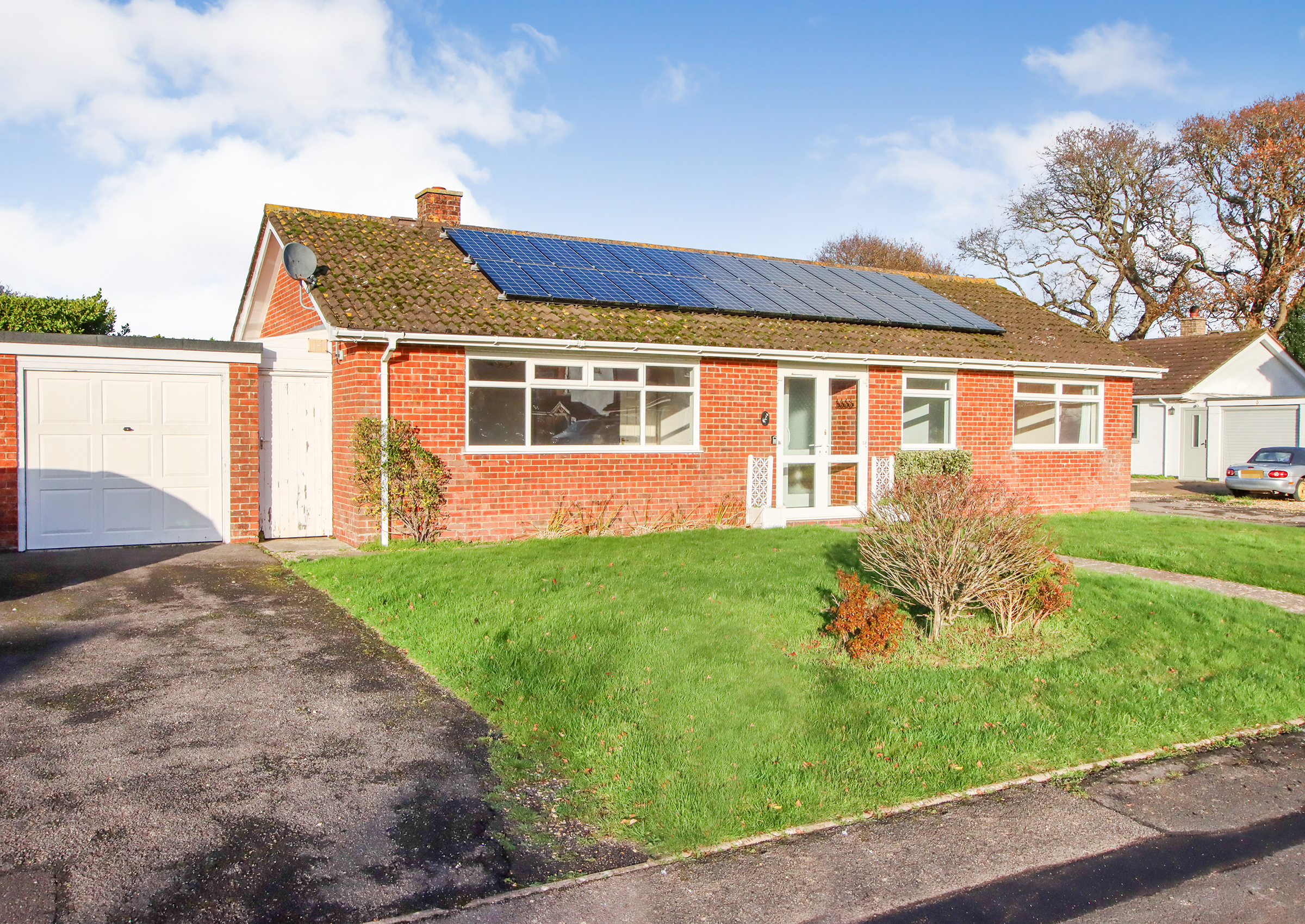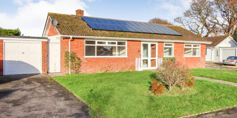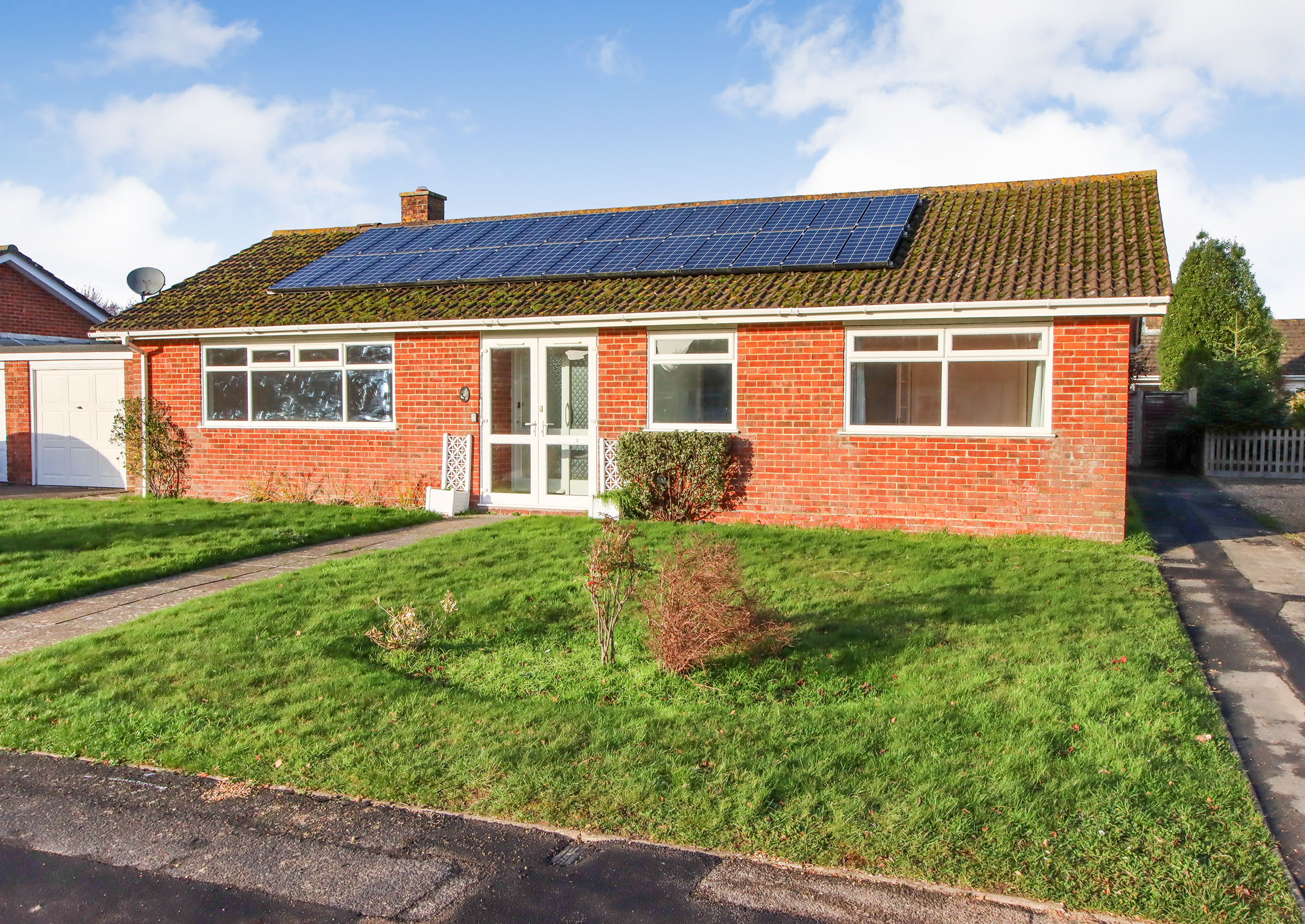 A paved pathway leads to the front of the property and an entrance door with side screen opens into an inner porch, which in turn leads through to the main entrance hall. From here there is useful coat storage and access to all principal rooms. The sitting and dining room is a spacious L-shaped room, enjoying a southerly aspect to the front with a large window bringing in plenty of natural light. There is ample space for both seating and dining areas, with sliding patio doors opening directly onto the rear garden. An airing cupboard is located off the dining area, housing the water tank and shelving. The kitchen is positioned to the rear of the property and is fitted with a range of base and eye level units with work surfaces and a one and a half bowl stainless steel sink. Integrated appliances include an electric hob with extractor over and a built-in double oven, with space provided for a fridge/freezer and washing machine, there is also a wall mounted Worcester boiler. A window overlooks the rear garden and a door leads out to a covered side passageway, providing access to the front and rear of the bungalow as well as a further door into the garage. There are three bedrooms, all accessed from the entrance hall. The main bedroom overlooks the rear garden and benefits from a range of built-in wardrobes. The second bedroom enjoys a southerly aspect and also has built-in wardrobe storage. The third bedroom, again with a southerly outlook, would make an ideal guest room, study or nursery. The shower room is fitted with a modern suite. In addition, there is a separate WC. The property also benefits from an oversized garage with an up and over door, currently arranged with a partition to provide both parking and useful workshop or storage space. Light and power are connected, with a window to the side and the gas meter located here. Outside, the bungalow sits within a good sized plot, with driveway parking and gardens to the rear, making this a well-proportioned home with plenty of potential. Agent’s Note: The property benefits from solar panels, with approximately 10 years remaining on a 25-year lease, providing free electricity. Further details are available on request.