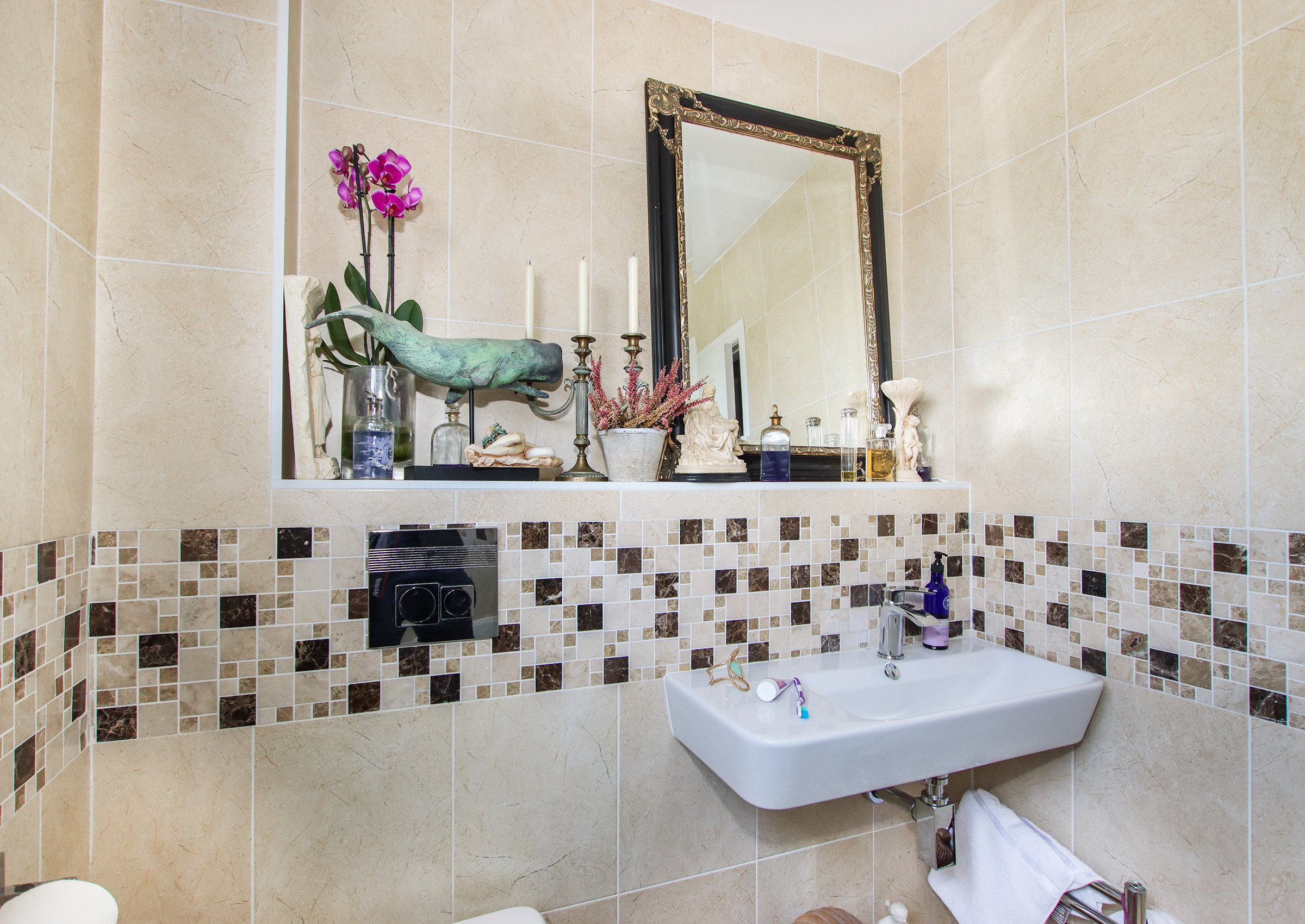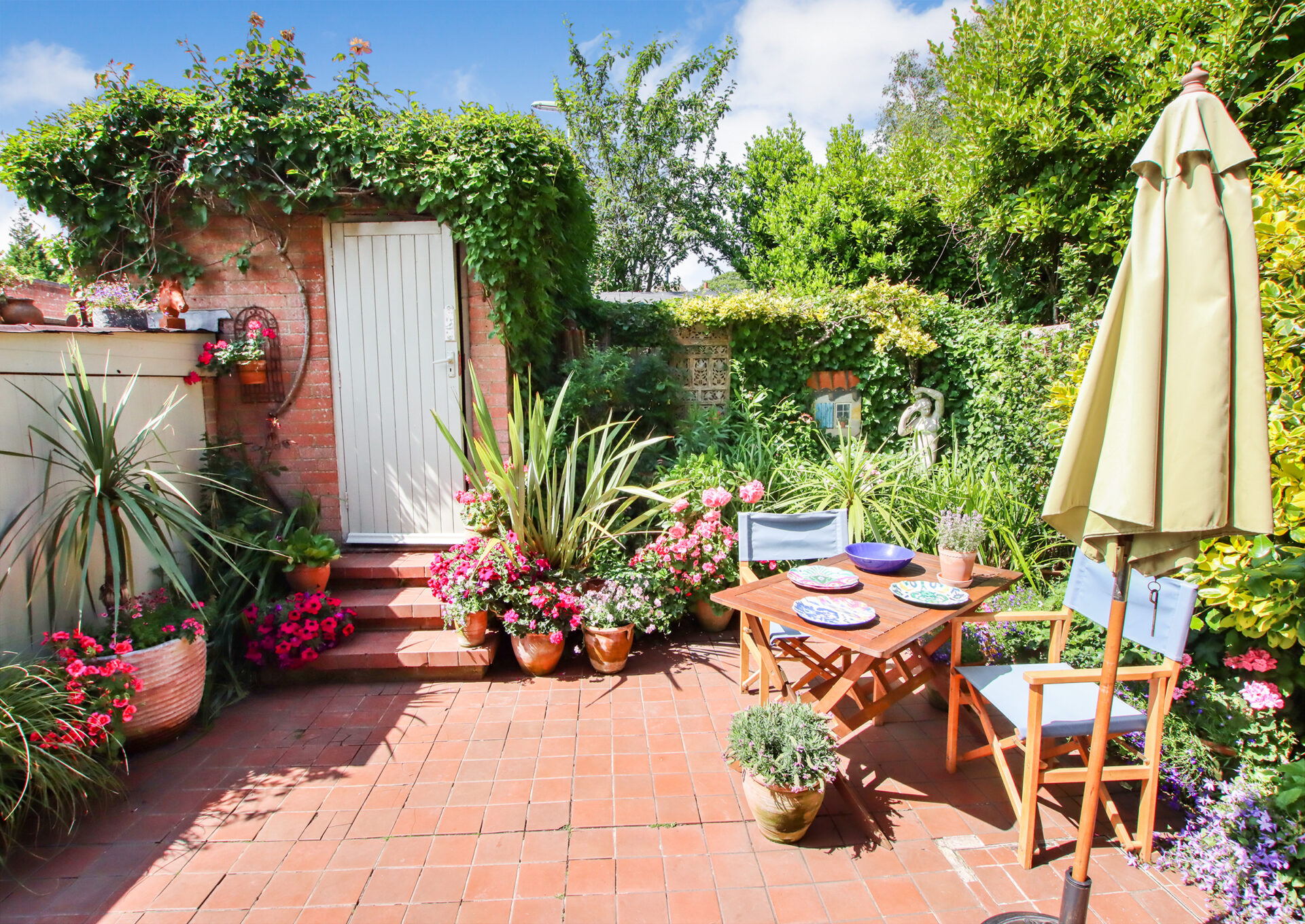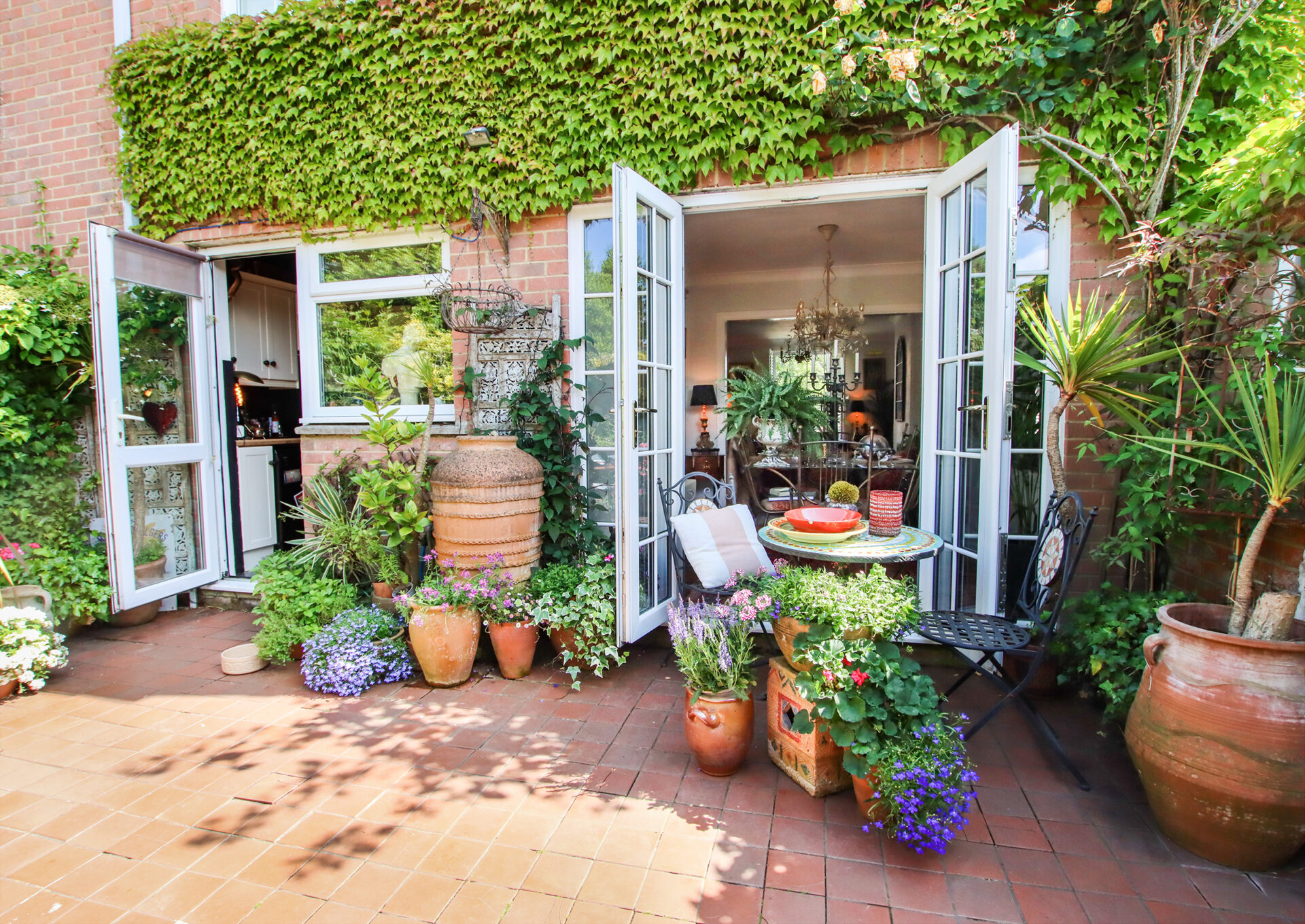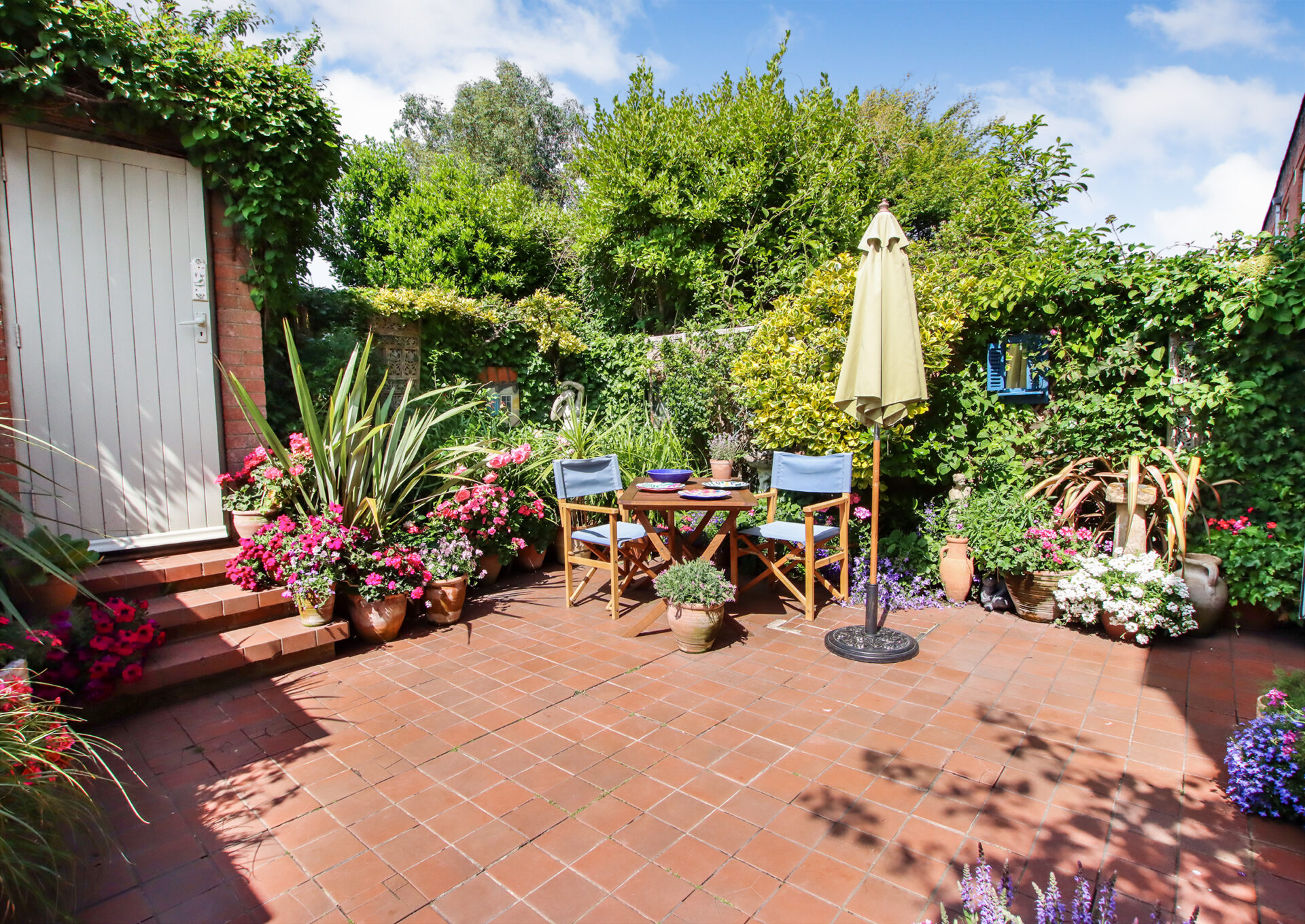 The front door, sheltered by a porch, opens into a welcoming entrance hall with a cloakroom/WC and a useful under-stairs cupboard. The spacious living room features an open fireplace and flows through to the dining room, where French doors open onto the rear garden. The adjacent kitchen is fitted with a range of cabinets, an integrated oven and hob and has additional appliance space, with a door leading directly outside. Upstairs, there are three bedrooms, two comfortable doubles and a third currently used as a study, all served by a modern family bathroom. Outside, the property boasts a neatly maintained open-plan front garden, mainly laid to lawn. The attractive rear garden is predominantly terracotta tiled, offering a private and low-maintenance space for outdoor relaxation with steps leading up to a personal door to the garage. The property benefits from two garages – one of which is accessed directly from the rear garden and features a useful laundry room with plumbing and space for appliances, as well as a storage area to the front. The second garage is located opposite and includes an up-and-over door. Wykeham Place is a well-kept development with a service charge for estate gardening (cost to be confirmed).