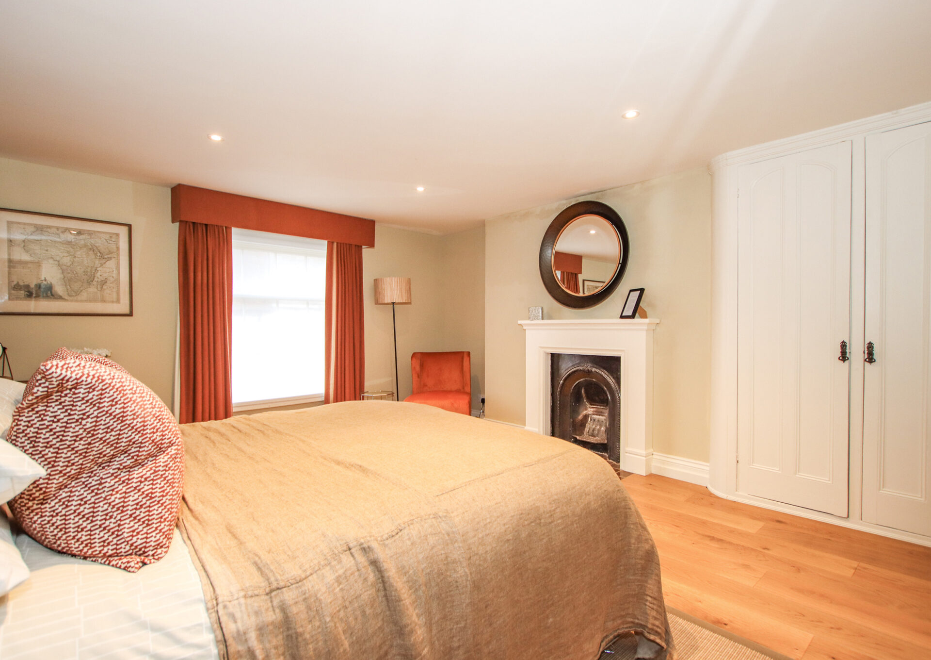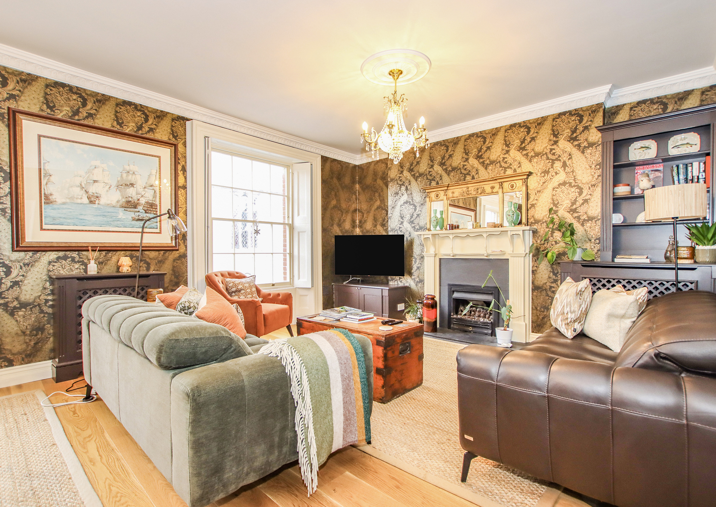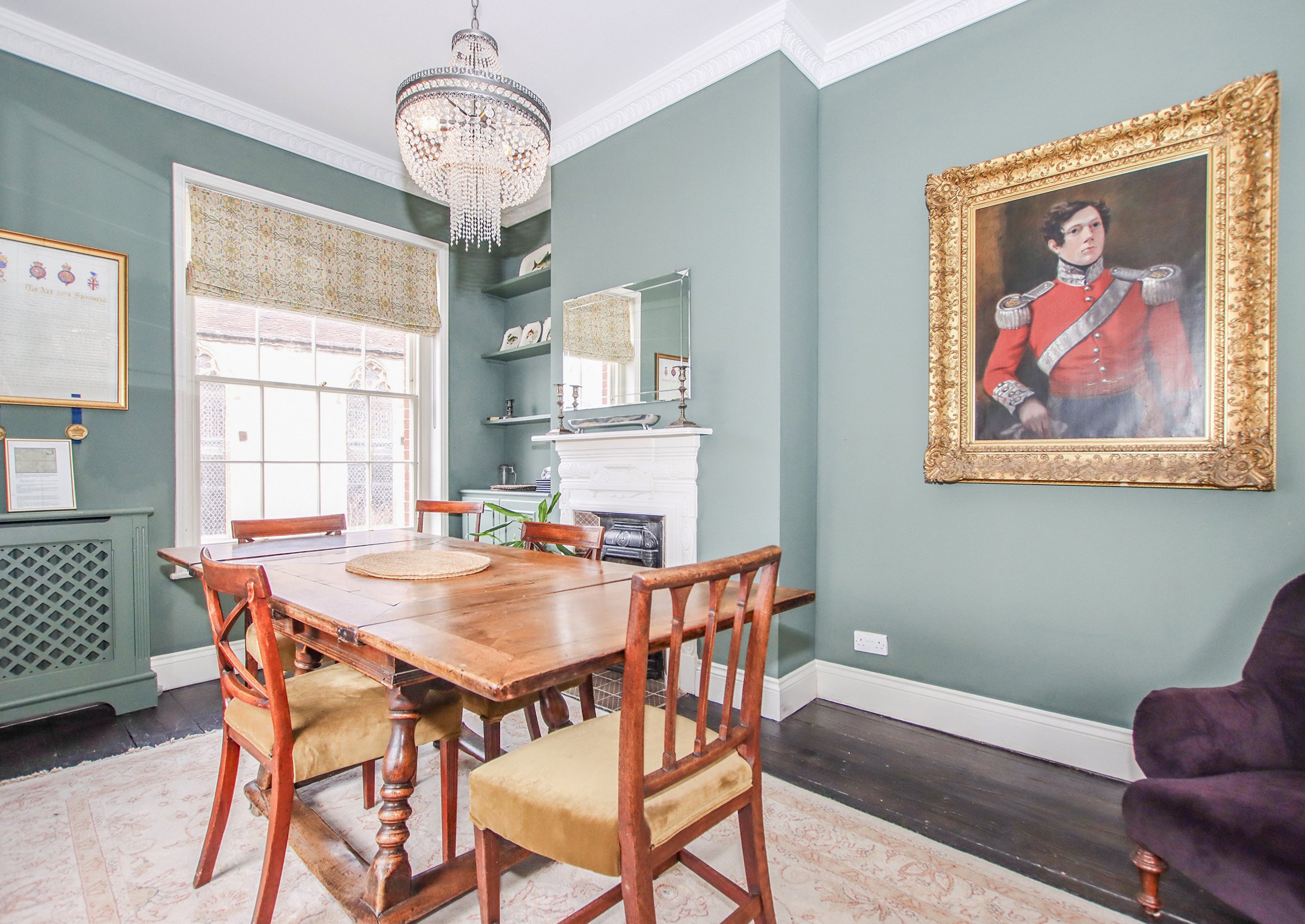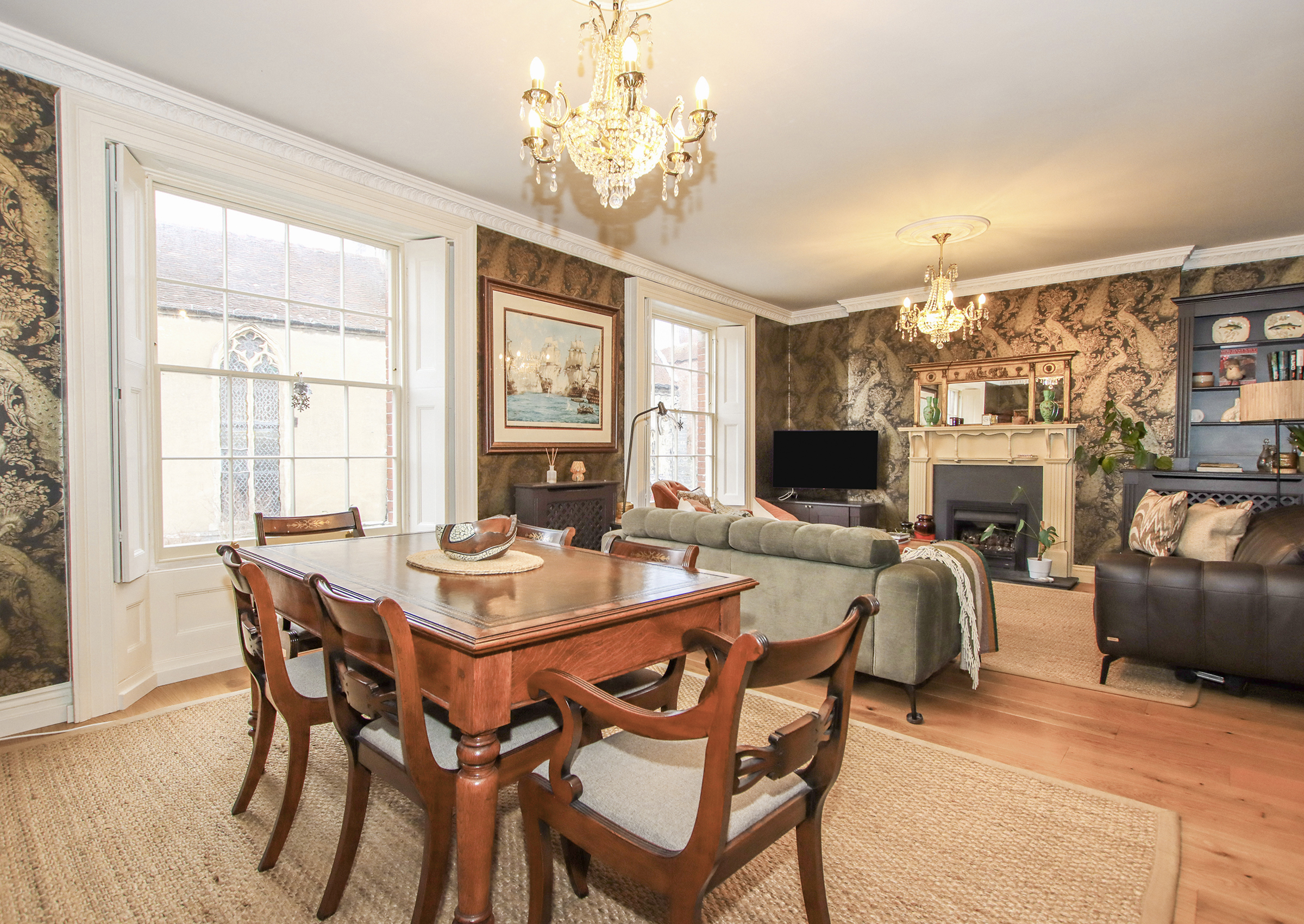 The upper storey delivers three well-balanced bedrooms, each offering excellent proportions. The principal suite benefits from a dual aspect alongside a tasteful en suite shower room. Two further bedrooms are served by a spacious family bathroom incorporating a separate shower enclosure. Throughout, period detailing has been carefully preserved, complemented by considered restoration including refurbished sash windows featuring wavy architectural glazing. Additional reassurance is provided by a secure entrance at ground level, combining heritage appeal with modern peace of mind. Altogether, this exceptional home represents a rare blend of historic elegance, thoughtful enhancement and an enviable town-centre position.