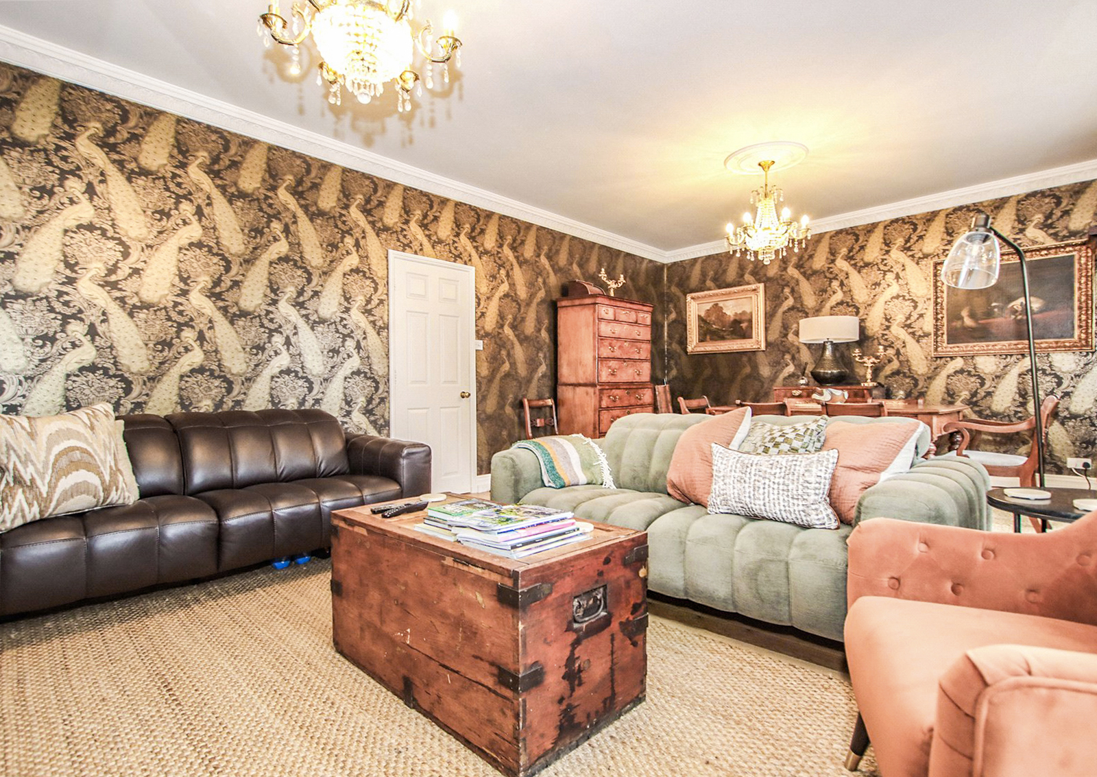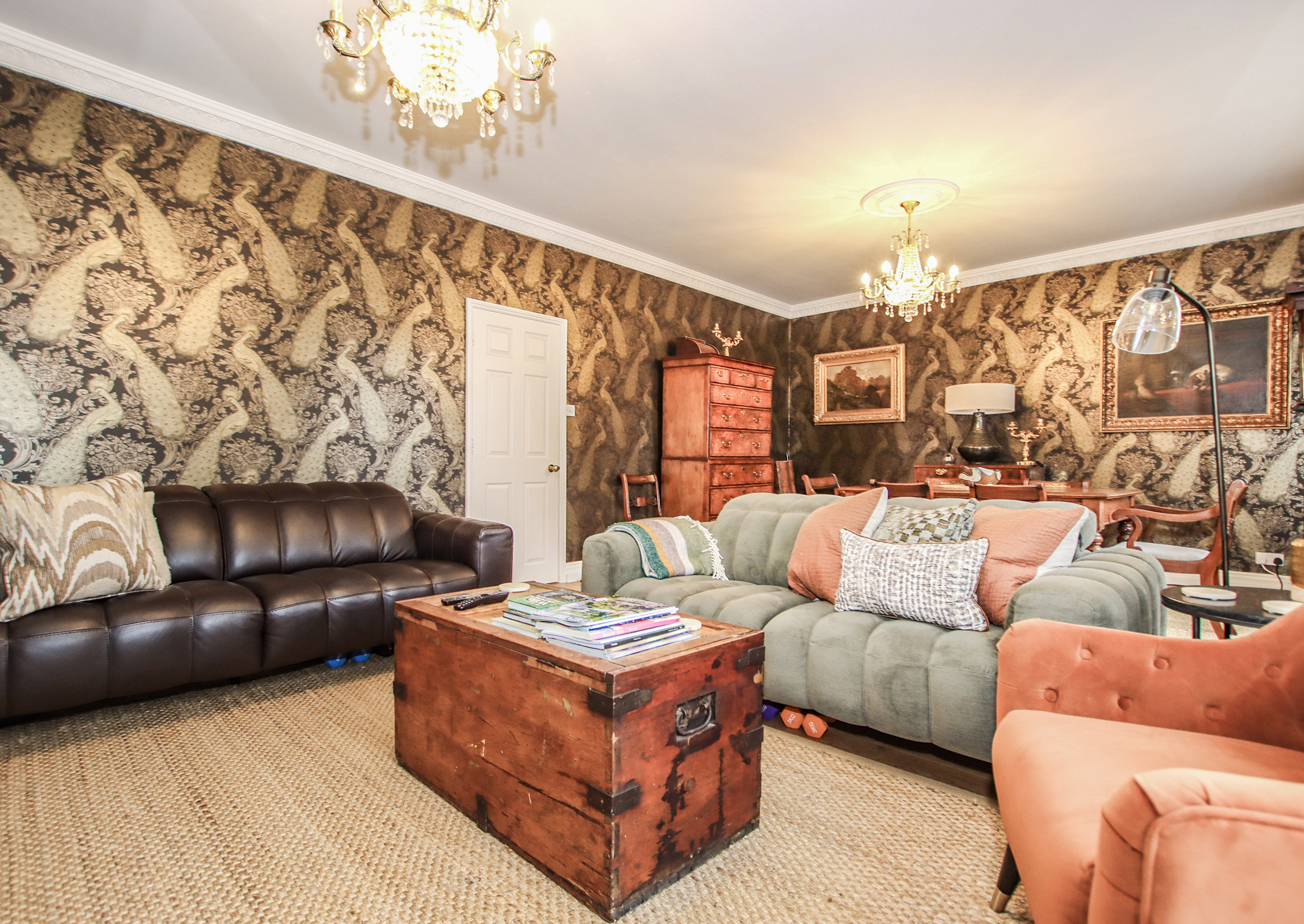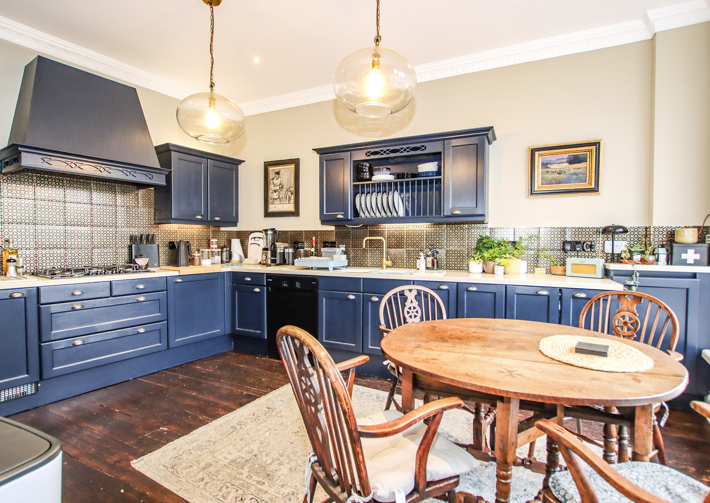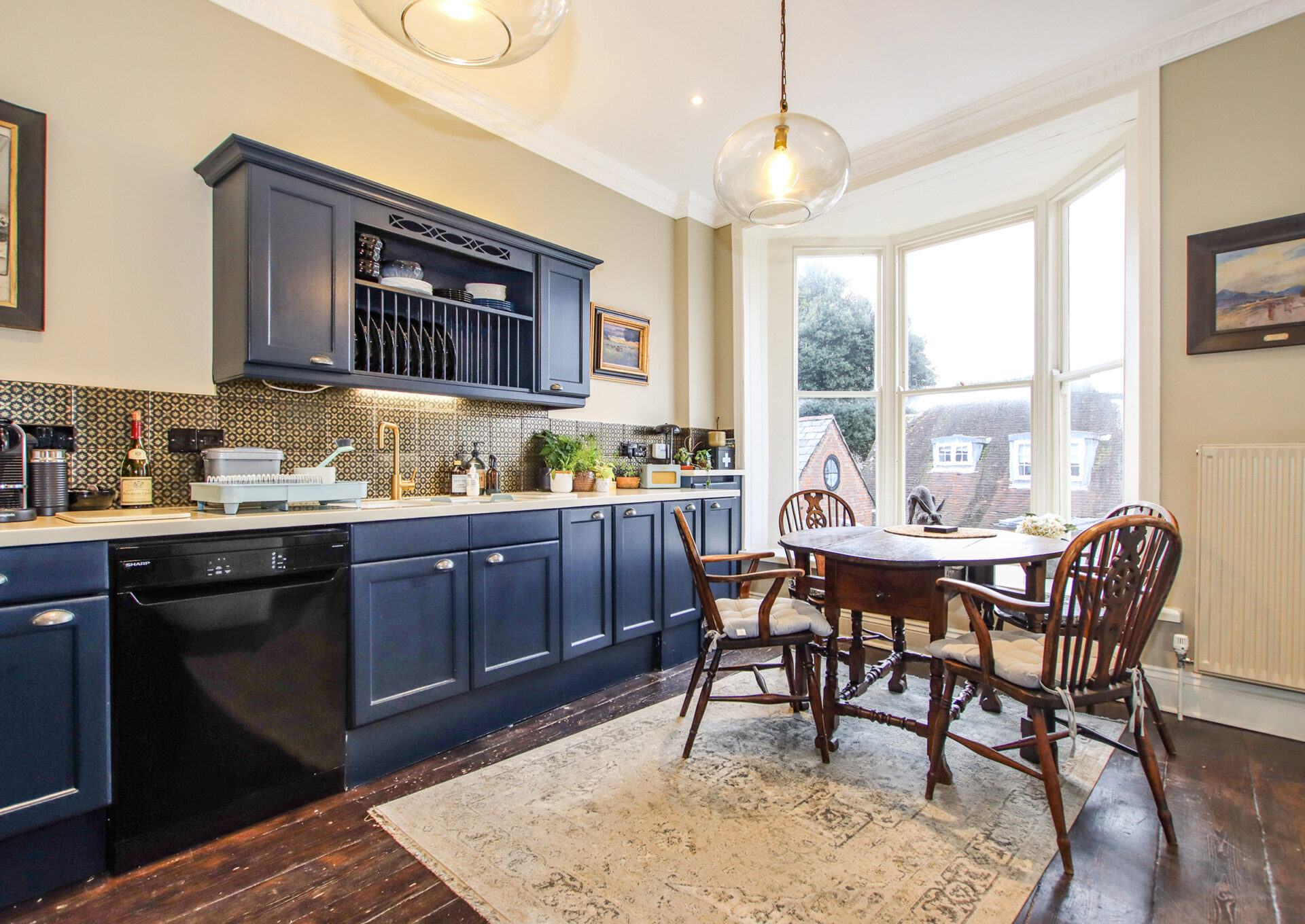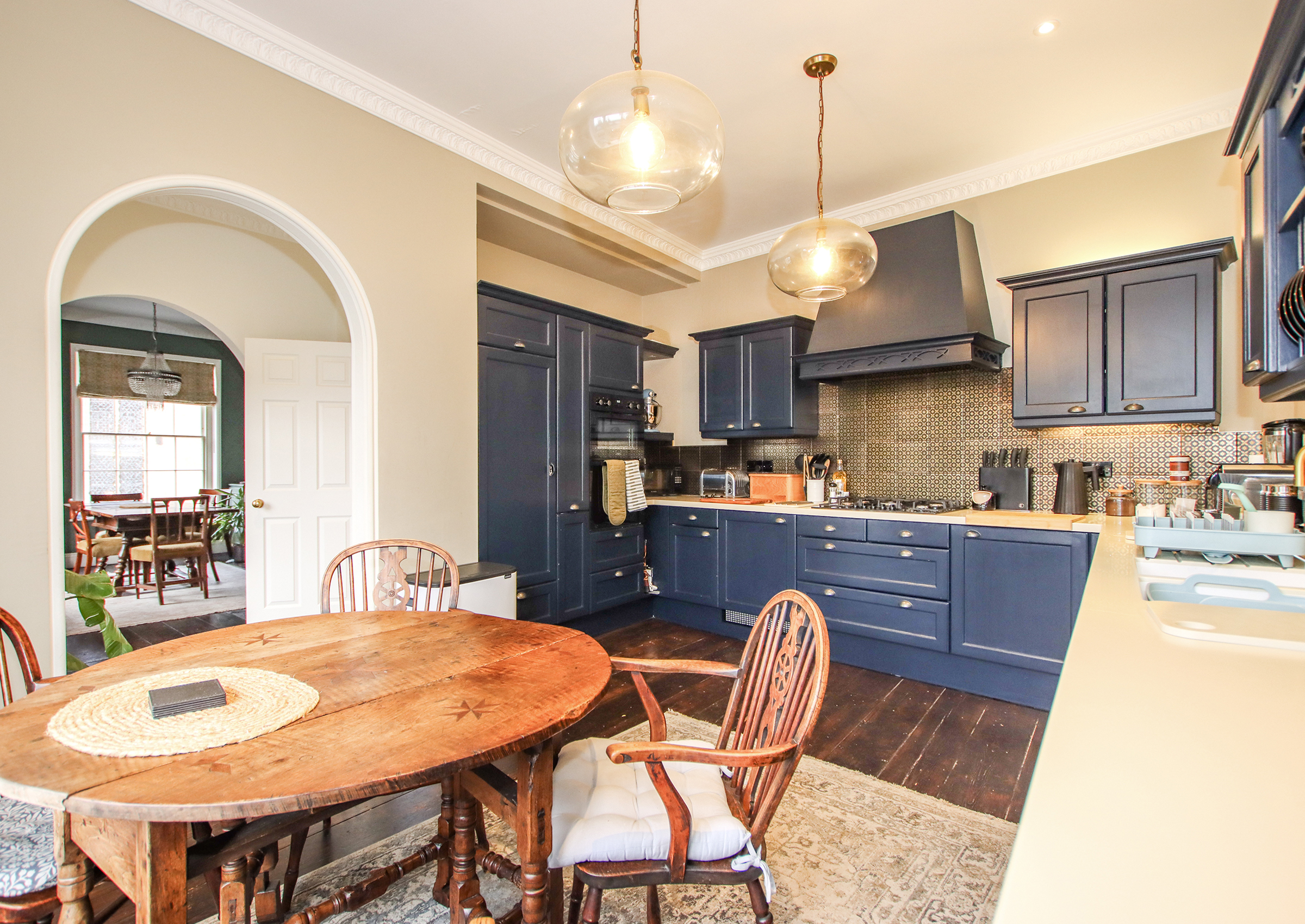 The drawing room presents a graceful setting, enhanced by tall sash windows and a traditional fireplace creating a refined focal point. Adjacent lies an impressive dining room enjoying light from two aspects, featuring connections to both the hall and the kitchen/breakfast space. This inviting room is fitted with an extensive range of hand-painted cabinetry, integrated appliances and a distinctive bay window lending character and charm.