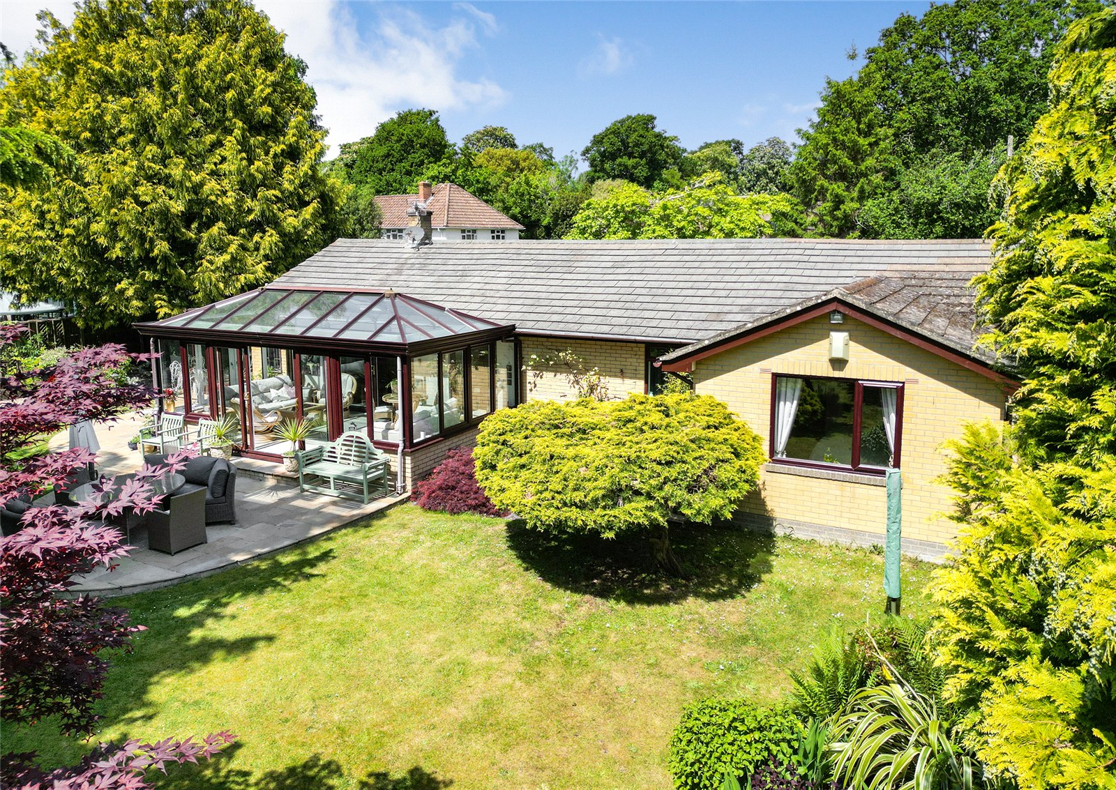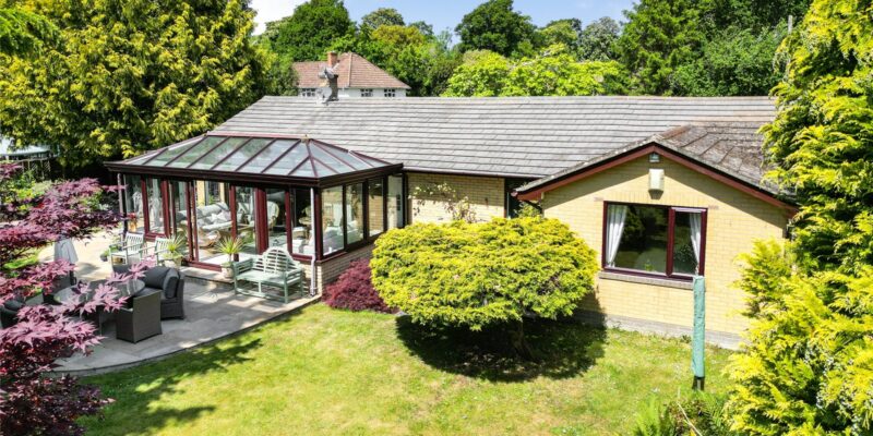 Occupying a generous plot of one third of an acre, this spacious single-storey home offers versatile accommodation, beautifully established gardens, ample parking, including a large carport and workshop, and two conservatories that make the most of its peaceful, natural setting. A wide entrance hallway sets a welcoming tone and leads to all principal rooms. The main living room features a stone fireplace and opens into a light-filled garden room via double doors, creating a relaxed, connected flow to the outdoors. At the rear, a further conservatory enjoys superb views over the landscaped garden. The well-fitted kitchen includes a range of integrated appliances along with space for a freestanding range cooker and is supported by a useful utility area. A separate dining room offers ample space for formal entertaining or family meals.