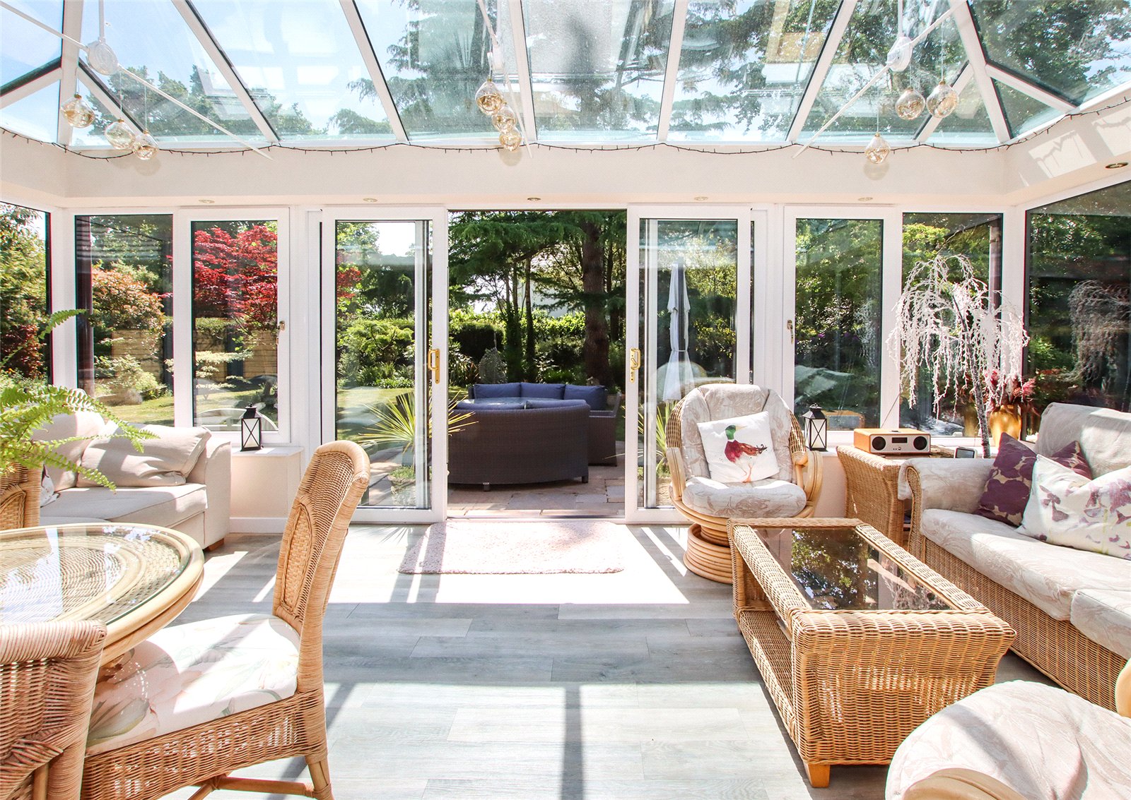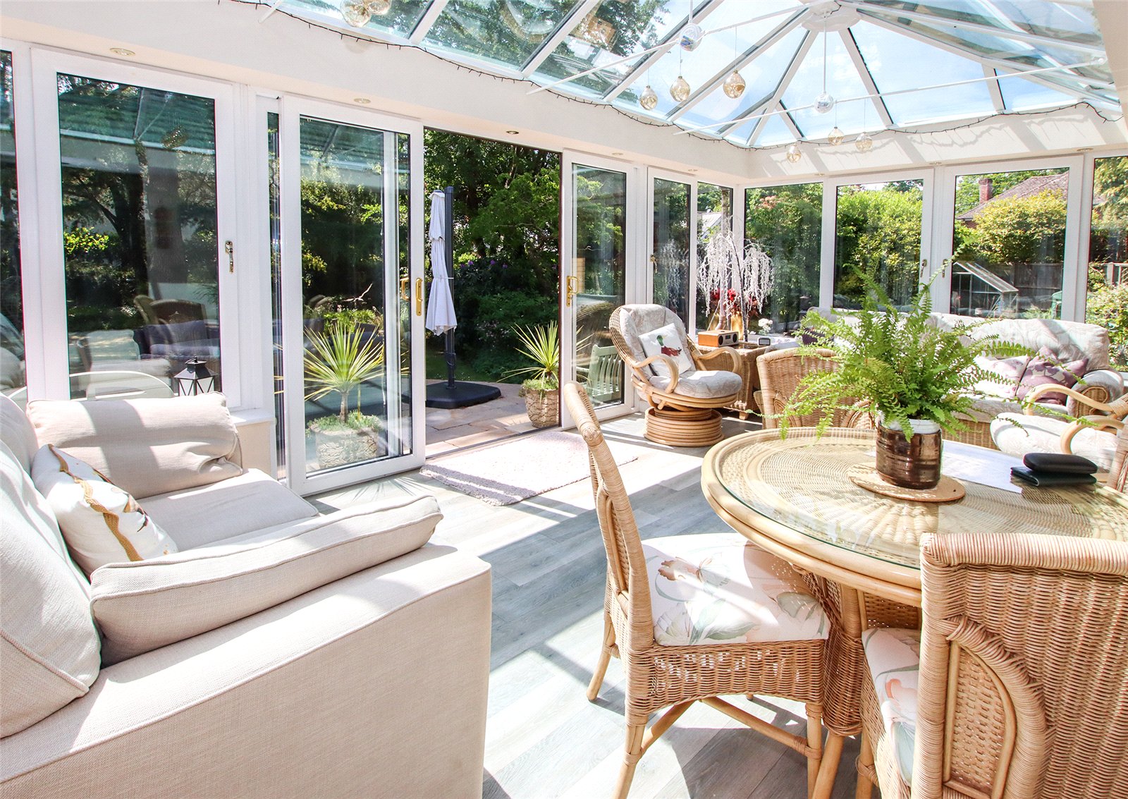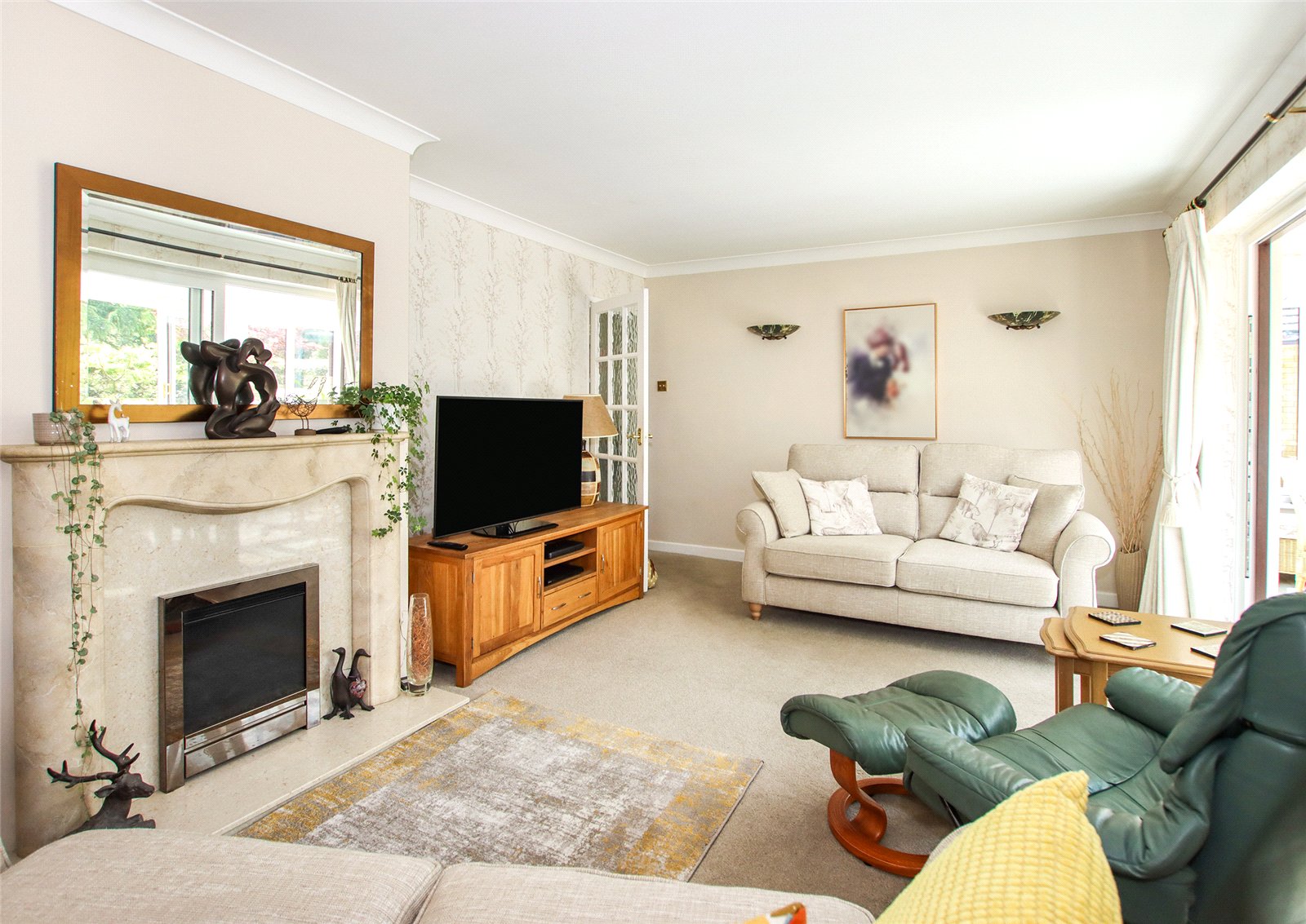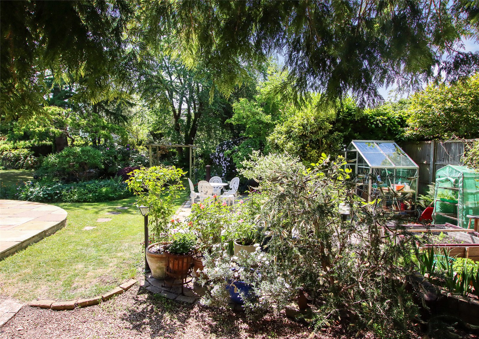 The rear garden is a particular highlight—facing south and laid mostly to lawn with mature borders and trees, complemented by an Indian sandstone patio ideal for outdoor dining and entertaining.