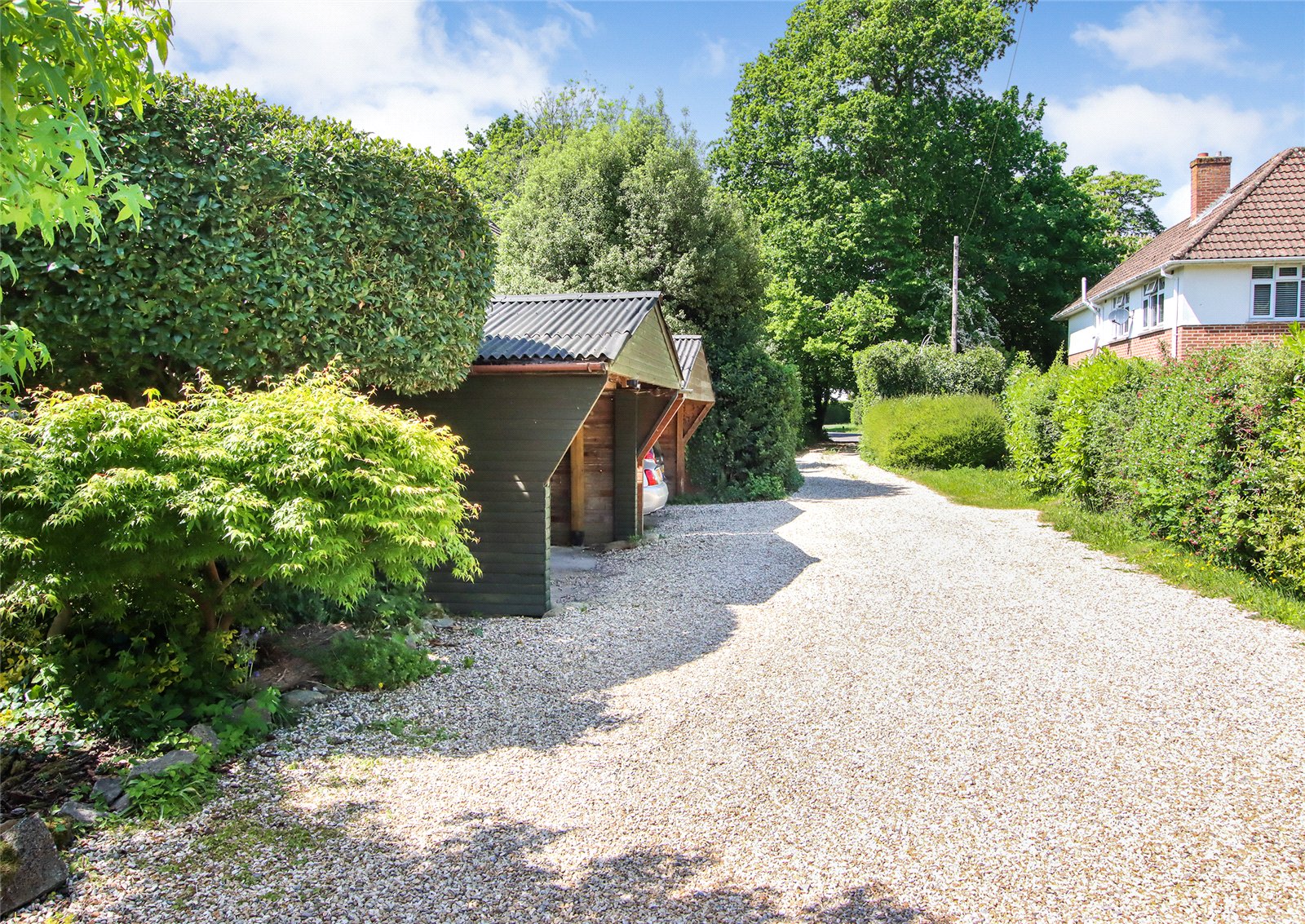 Outside, the property is approached via a sweeping gravel driveway offering extensive off-road parking. A large carport provides covered parking and includes a workshop space to the rear.