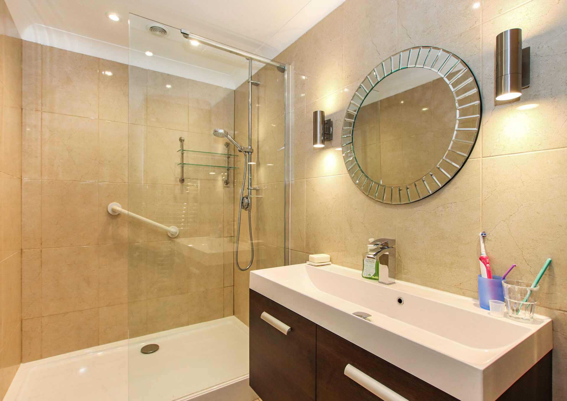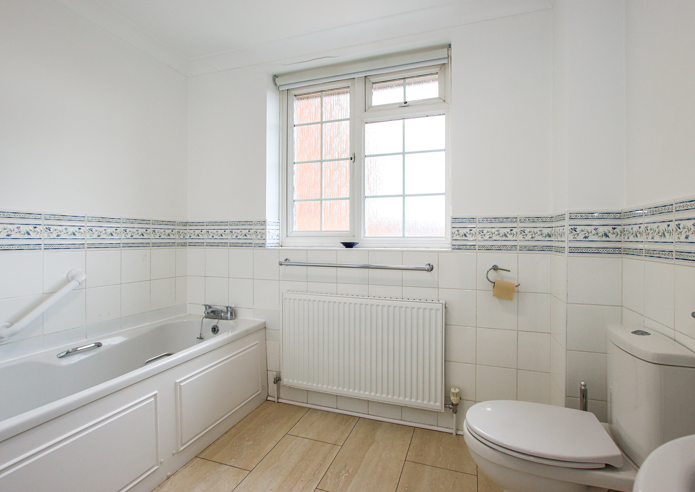 The main bedroom has an en suite shower room with a double shower enclosure, WC, wash hand basin with storage, tiled walls and floor, and a heated towel rail. Bedroom two is a comfortable double facing the front, while bedroom three is currently arranged with a small double bed but could also serve as a generous single. The family bathroom offers a bath, separate shower, WC, and wash hand basin.