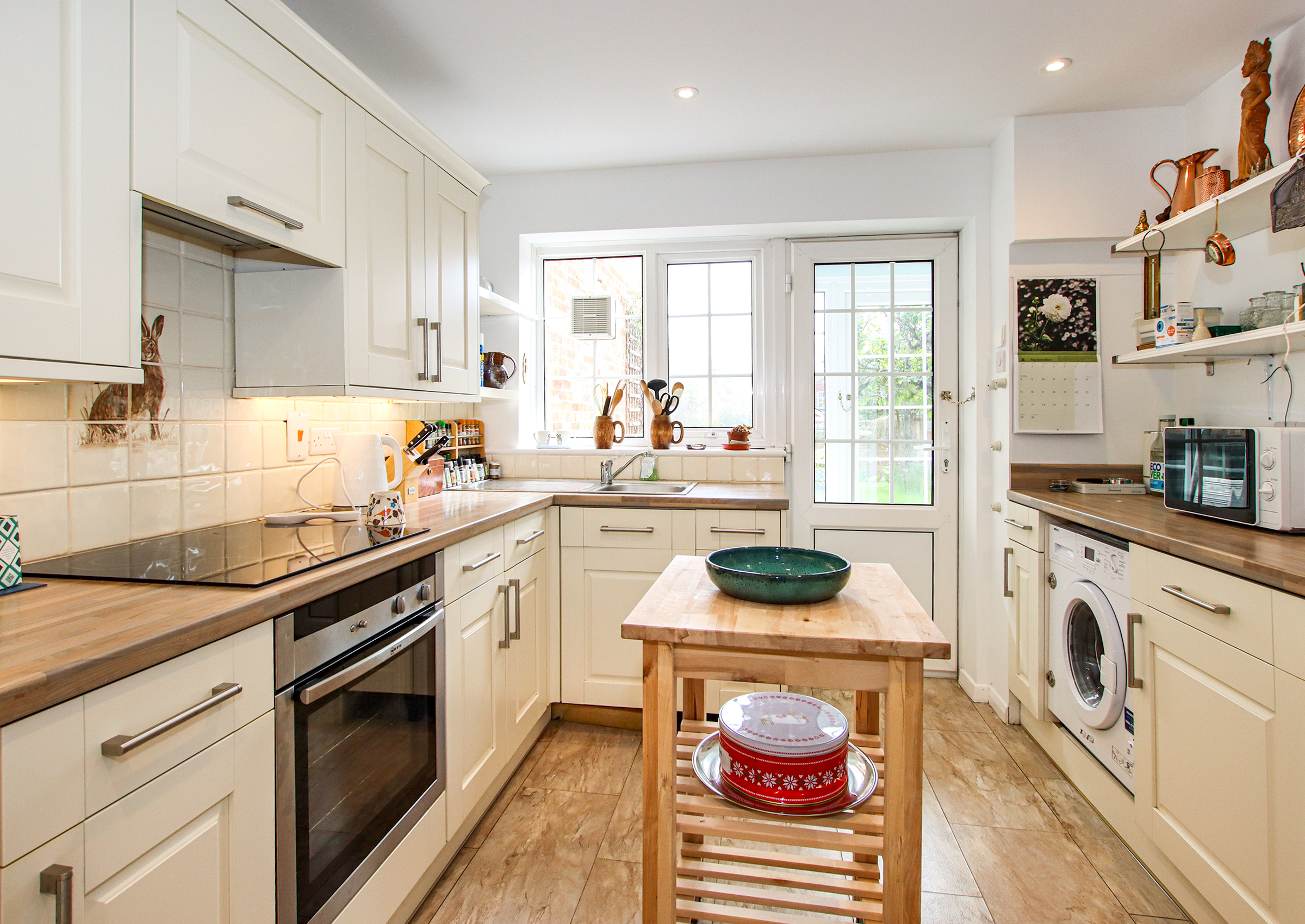 The kitchen, which is fitted with cream-coloured base and wall units, a Neff electric oven, halogen hob with extractor, integrated washing machine and dishwasher, and space for a fridge/freezer. The kitchen has been enhanced with a false ceiling incorporating downlighters, along with new shelving. A rear porch with tiled floor provides direct access to the garden and also houses space and wiring for a tumble dryer. On the first floor, the landing includes a double airing cupboard housing the hot water cylinder and the updated gas central heating boiler.