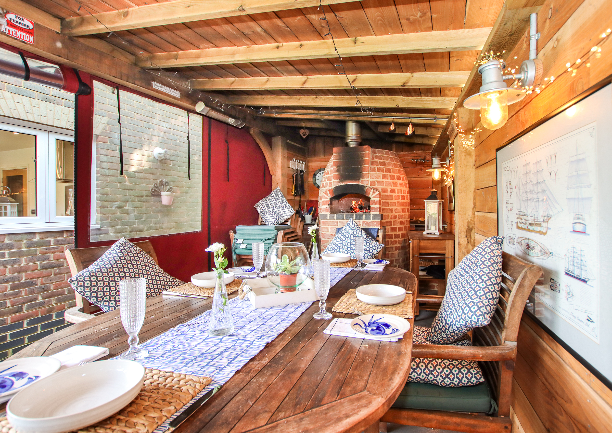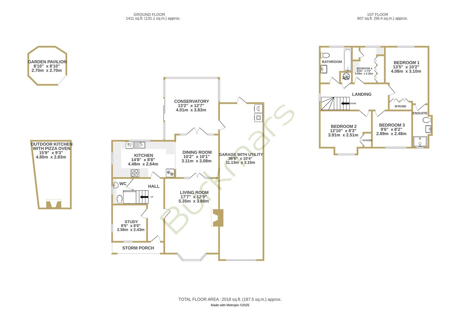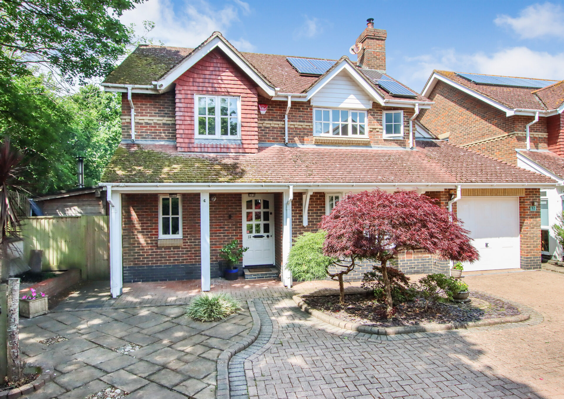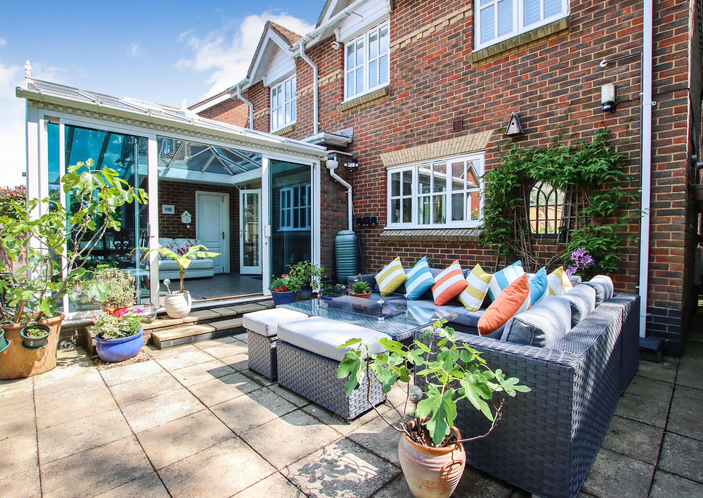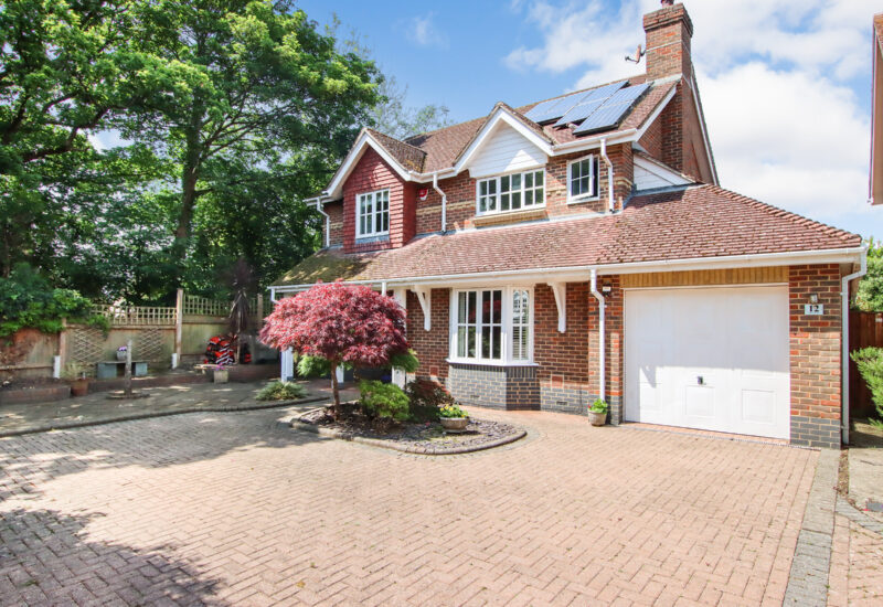The front door opens into a welcoming hallway with stairs rising to the first floor and a cloakroom with WC beneath. To the front of the house, the spacious living room features a bay window and a fireplace with a Clearview wood-burning stove. Double doors lead through to the dining room, which in turn opens into a bright conservatory with UV-filtering blue glass and underfloor heating — a comfortable year-round space with access to the garden and garage. The kitchen is fitted with a comprehensive range of cabinets topped with oak work surfaces and includes a Quooker boiling water tap, gas hob, electric oven and integrated dishwasher. The kitchen flows into the dining room, creating a sociable and practical layout. A double-aspect study offers a peaceful space for working from home. Upstairs, the principal bedroom includes fitted wardrobes and an en suite shower room. There are two further double bedrooms and a fourth bedroom currently arranged as a dressing room with a range of built-in wardrobes and drawers. The family bathroom serves the remaining bedrooms. Both bathrooms feature illuminated mirrors with integrated Bluetooth speakers. Outside, the front garden has been attractively landscaped with areas of paving, mature shrubs including Acers and a brick-paved driveway providing off-road parking leading to the tandem-length garage. The garage includes a utility area with space for a washing machine and tumble dryer, as well as a personal door to the garden. The rear garden is beautifully designed with lawn, raised borders and patio seating areas. A standout feature is the bespoke oak-framed outdoor kitchen complete with a brick pizza oven, alongside a high-quality cedar Crown Pavilion – perfect for entertaining and relaxing. The property benefits from an alarm and CCTV system for peace of mind. The boiler and pressurised hot water tank were replaced just 18 months ago. Solar panels with a feed-in tariff contribute to energy efficiency and the hot water system is also solar-assisted.
