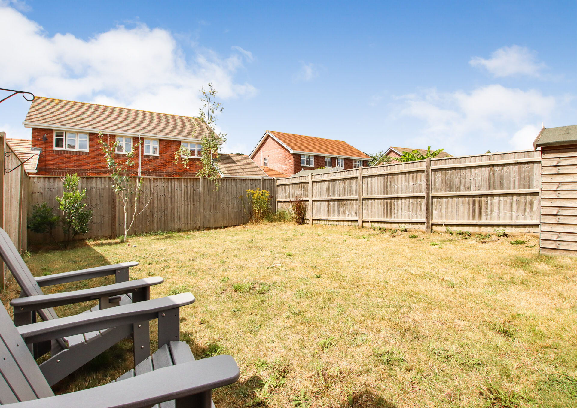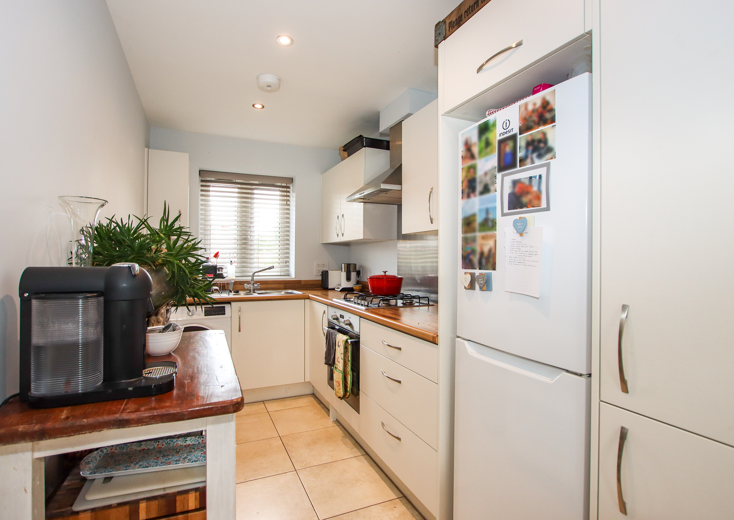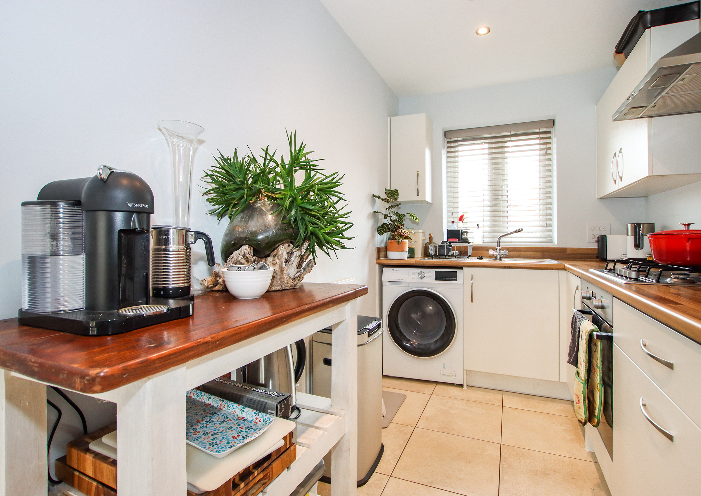 A covered storm porch shelters the front door, which opens into a welcoming entrance hall with a cloakroom/WC. The contemporary kitchen is fitted with a range of floor and wall mounted units and includes an integrated electric oven, gas hob and extractor, with space for a washing machine and tall fridge/freezer. To the rear of the property, the light-filled living room features French doors opening directly onto the garden, with a large under-stairs storage cupboard and space for dining. Upstairs, the generous principal bedroom enjoys views over the garden, while the second double bedroom includes a large built-in cupboard housing the gas-fired boiler. The stylish family bathroom is fully tiled and fitted with a panelled bath and shower over, WC and vanity basin unit. Outside To the front, a pathway leads to the entrance, with a private driveway to the side providing parking for two to three vehicles. The west-facing rear garden is a particular feature of this property, enjoying plenty of afternoon and evening sunshine. The garden is fully enclosed by timber fencing and includes a lawned area, paved patio ideal for outdoor dining and a useful garden shed. A rear gate provides easy access.