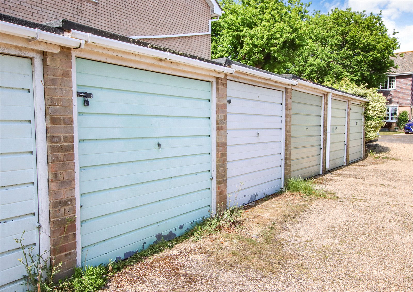 The rear garden is walled and well maintained, with a mix of patio, lawn, shrub borders, and a shingled seating area. A garage located in a nearby block provides additional storage or secure parking.