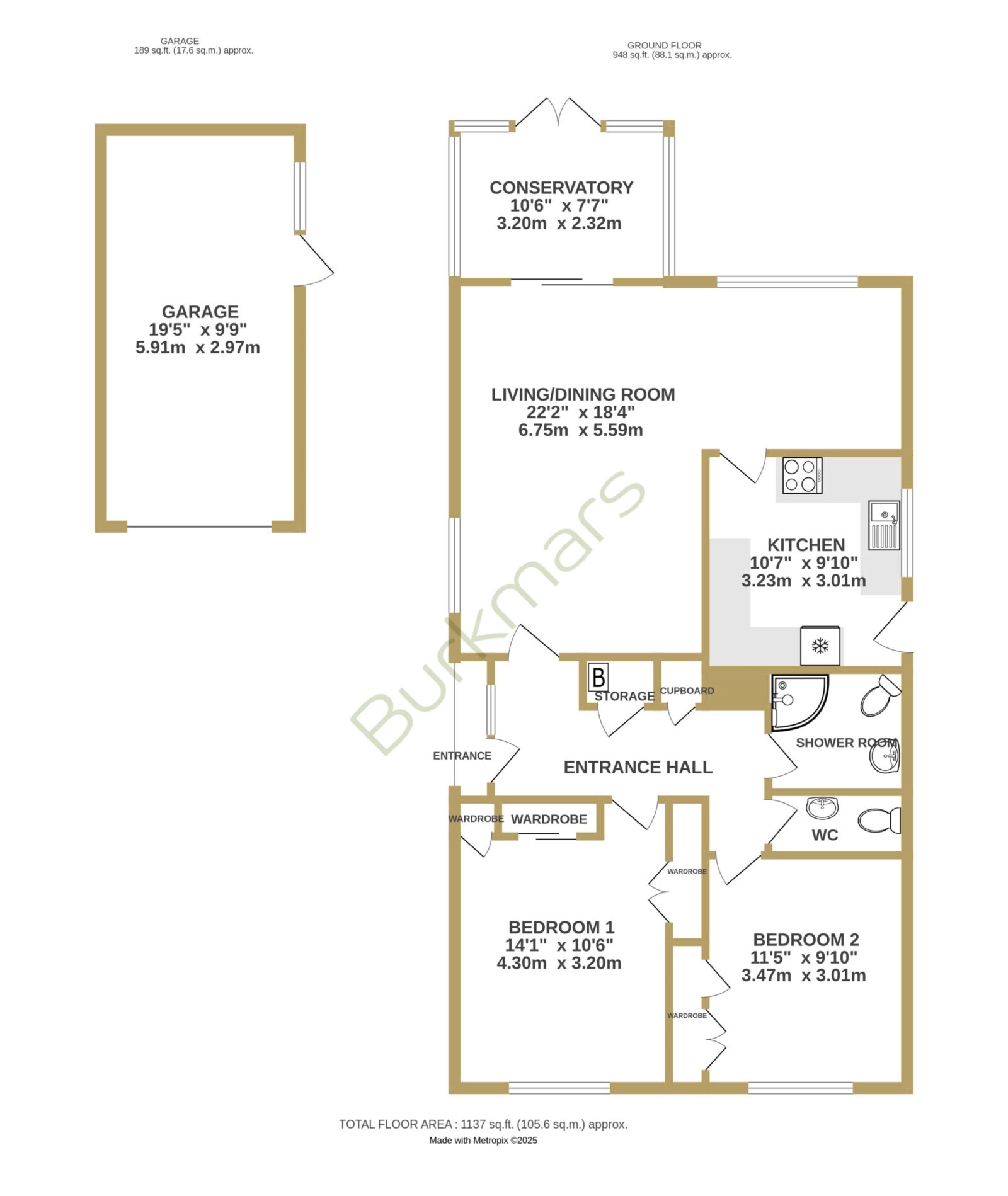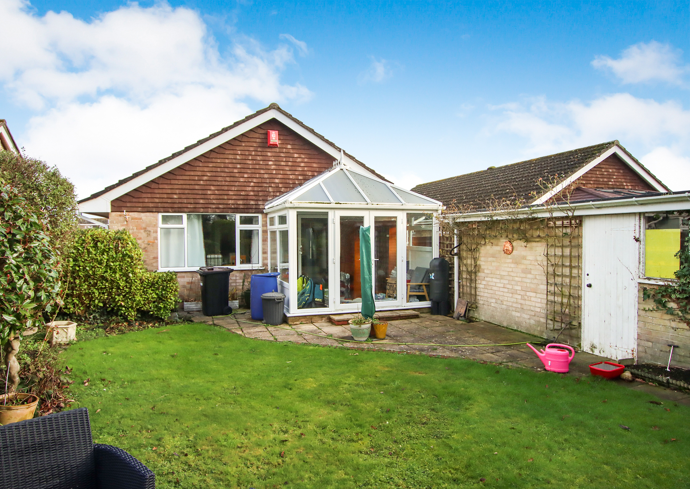 The entrance door opens into the hallway, with a cloakroom/WC for convenience. From here, the spacious L-shaped living/dining room offers a bright and comfortable space with large windows overlooking the garden. Patio doors lead into the conservatory with additional French doors leading directly to the patio area, making it perfect for enjoying the garden. The kitchen is fitted with a range of cabinets along with an integrated oven and hob. There is also space for further appliances and a door leads directly outside. Both bedrooms are doubles, each featuring fitted wardrobes, served by a shower room. Outside, to the front of the property, the bungalow is fronted by a neat area of lawn. The driveway runs along the side of the house, providing ample off-road parking and leading to the garage, which has a personal door that opens into the garden for easy access. The rear garden has a patio area adjoining the bungalow, as well as a lawn, a shed and a shingled seating area. A hedge with an arch leads to another section of the garden, which is laid to lawn and bordered by mature shrubs and trees. Additionally, the 16 solar panels on the roof not only provide electricity to power the home but also generate an income, adding a smart financial benefit and enhancing the sustainability of the property.