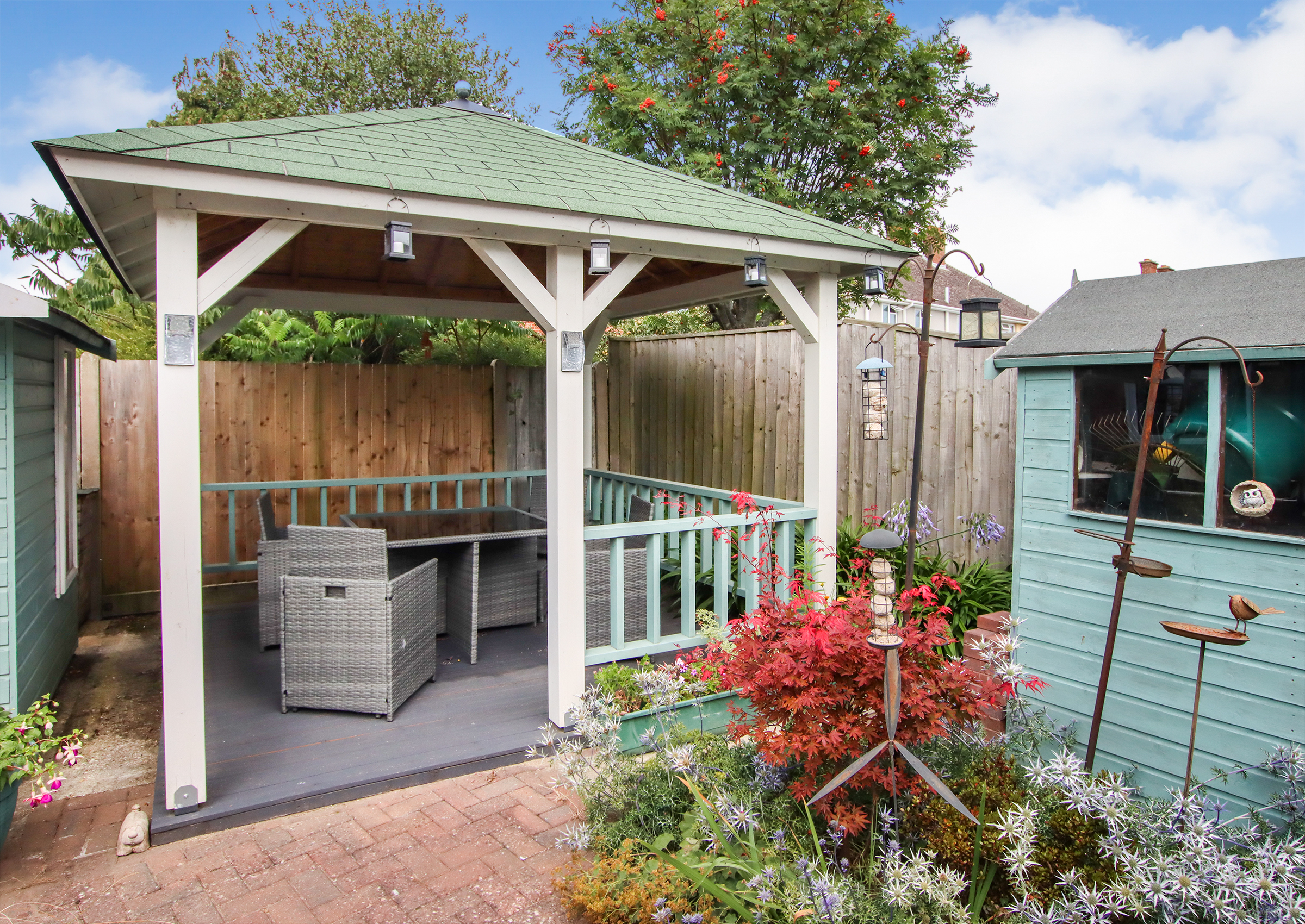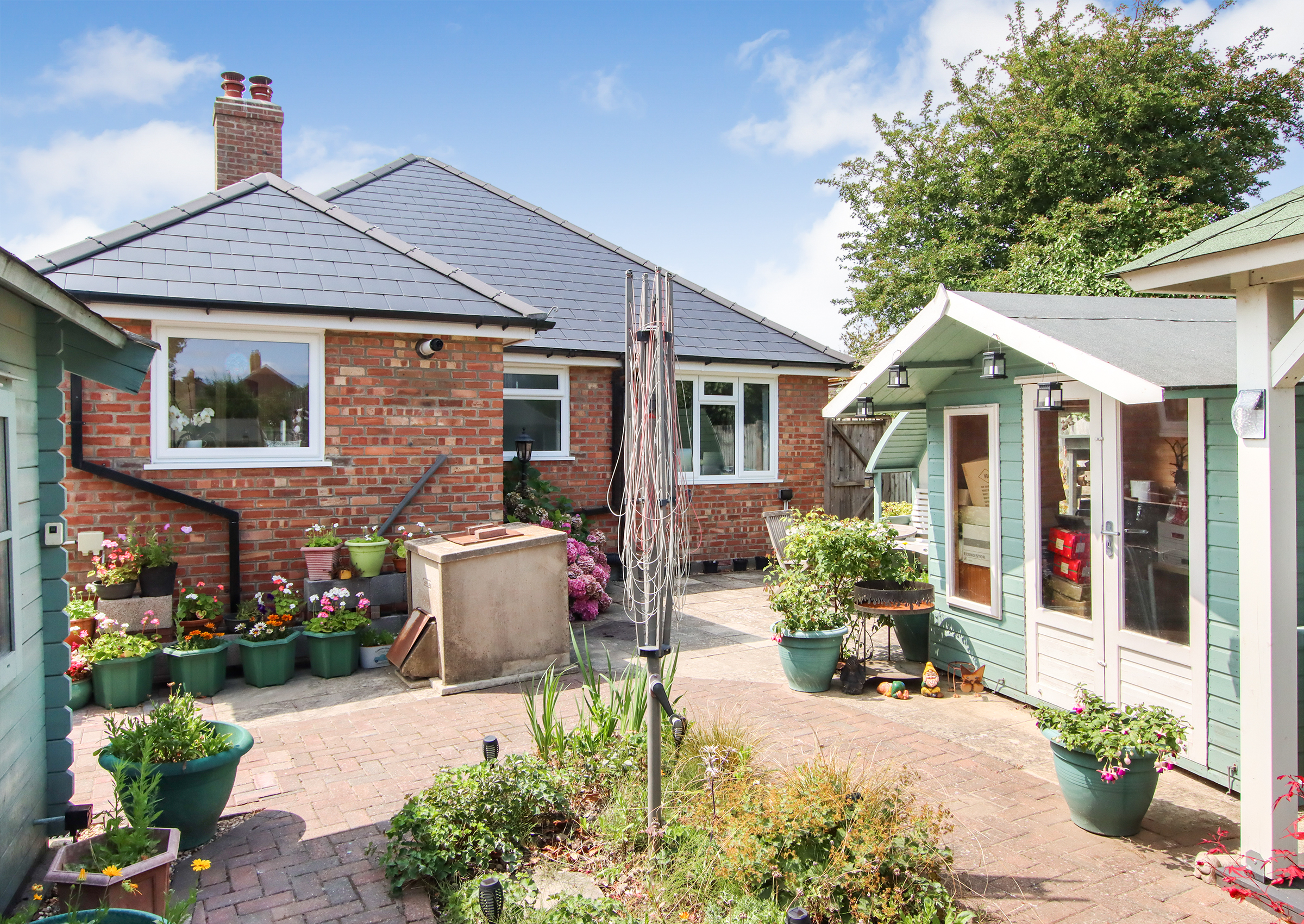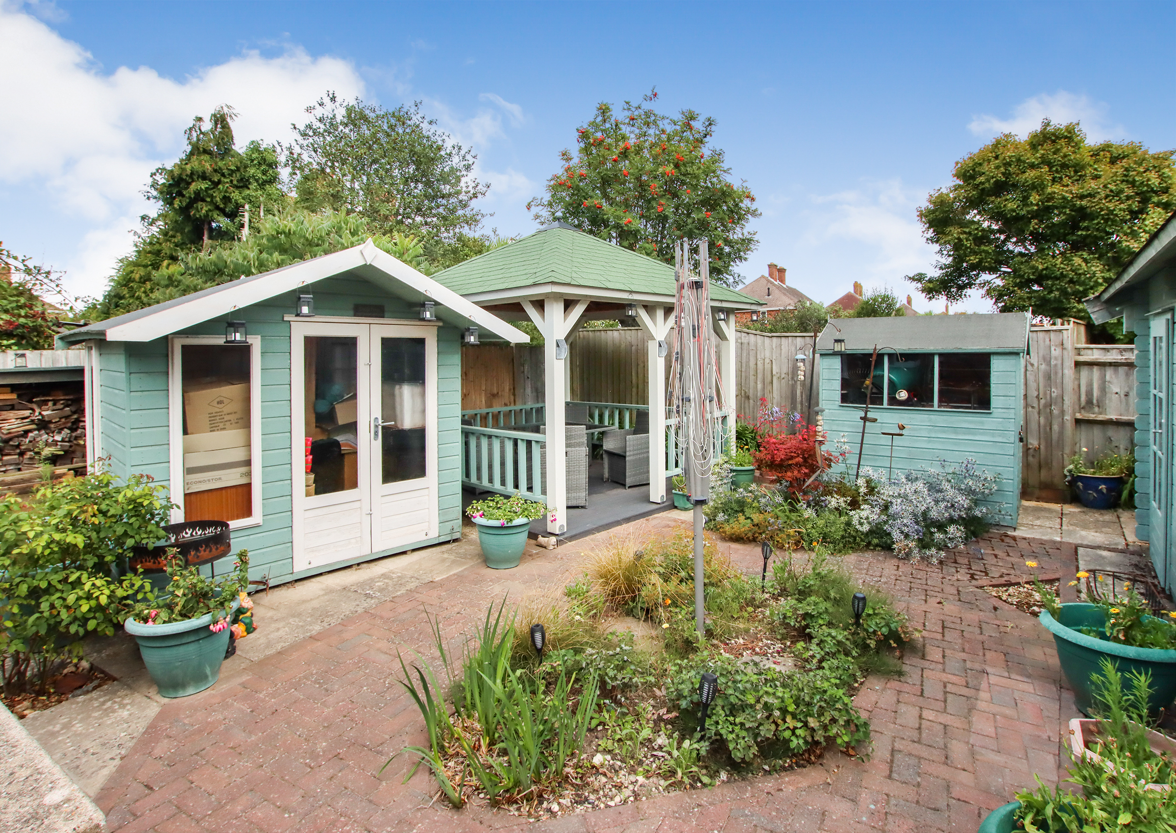 A bright entrance hall welcomes you into the home and provides access to all principal rooms. At the front, a generous living room features a large bay window and flows into a separate dining room, offering the option to knock through and create open-plan space if desired. The kitchen sits at the rear of the property with direct access to the garden and includes ample storage and workspace. Two spacious double bedrooms are positioned at opposite ends of the hall for privacy, each with built-in storage. A centrally located, modern shower room completes the internal layout. Outside The front of the property features a neatly presented brick-paved driveway providing off-street parking. To the rear is a private, low-maintenance garden, thoughtfully laid out for ease of care. At the heart of the garden is a pergola-covered seating and dining area, ideal for enjoying meals outdoors or entertaining guests in the warmer months. A standout feature is the large timber workshop/garden store, fully powered and ideal for use as a workspace, hobby room, or simply additional storage.
