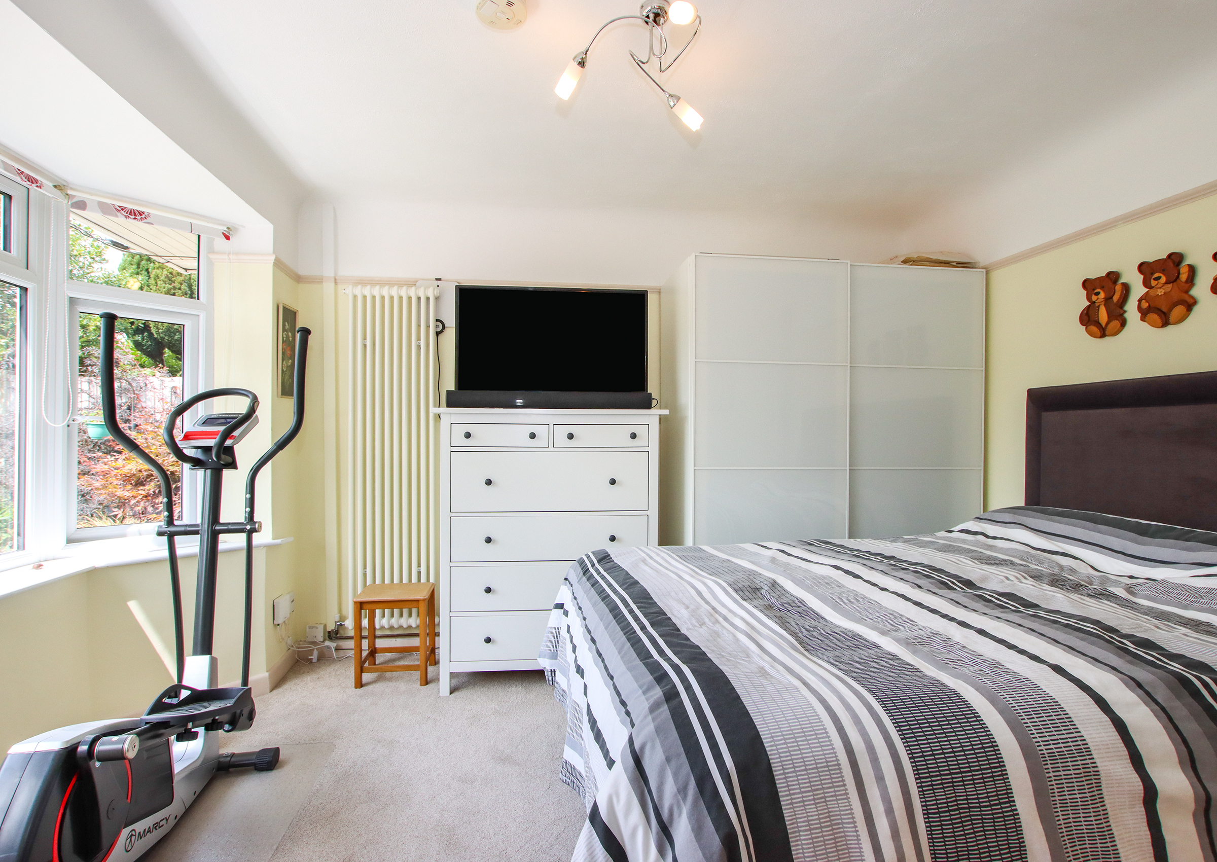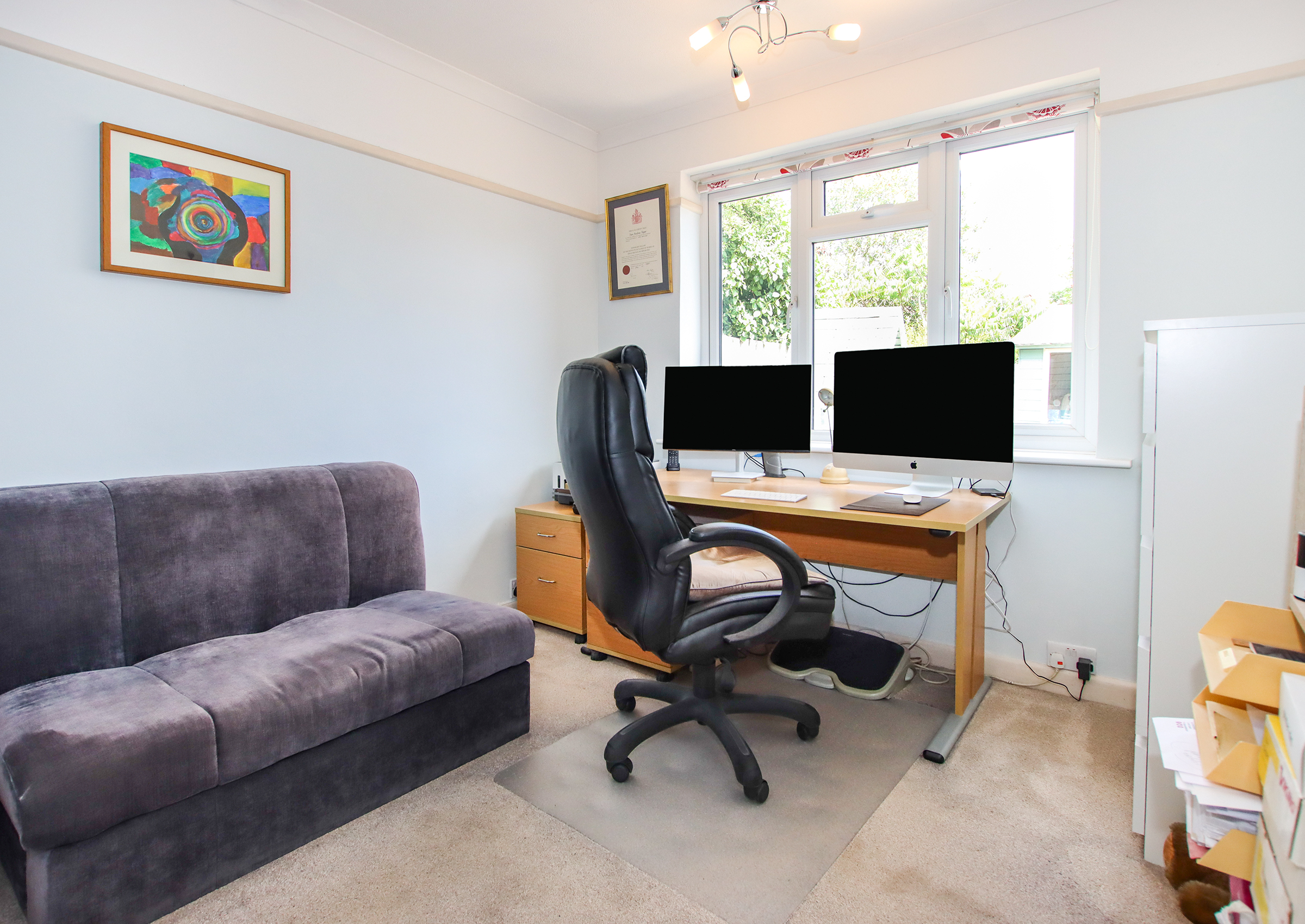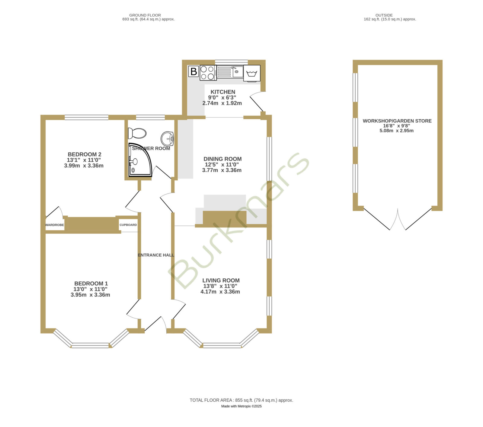 A bright entrance hall welcomes you into the home and provides access to all principal rooms. At the front, a generous living room features a large bay window and flows into a separate dining room, offering the option to knock through and create open-plan space if desired. The kitchen sits at the rear of the property with direct access to the garden and includes ample storage and workspace. Two spacious double bedrooms are positioned at opposite ends of the hall for privacy, each with built-in storage. A centrally located, modern shower room completes the internal layout. Outside The front of the property features a neatly presented brick-paved driveway providing off-street parking. To the rear is a private, low-maintenance garden, thoughtfully laid out for ease of care. At the heart of the garden is a pergola-covered seating and dining area, ideal for enjoying meals outdoors or entertaining guests in the warmer months. A standout feature is the large timber workshop/garden store, fully powered and ideal for use as a workspace, hobby room, or simply additional storage.